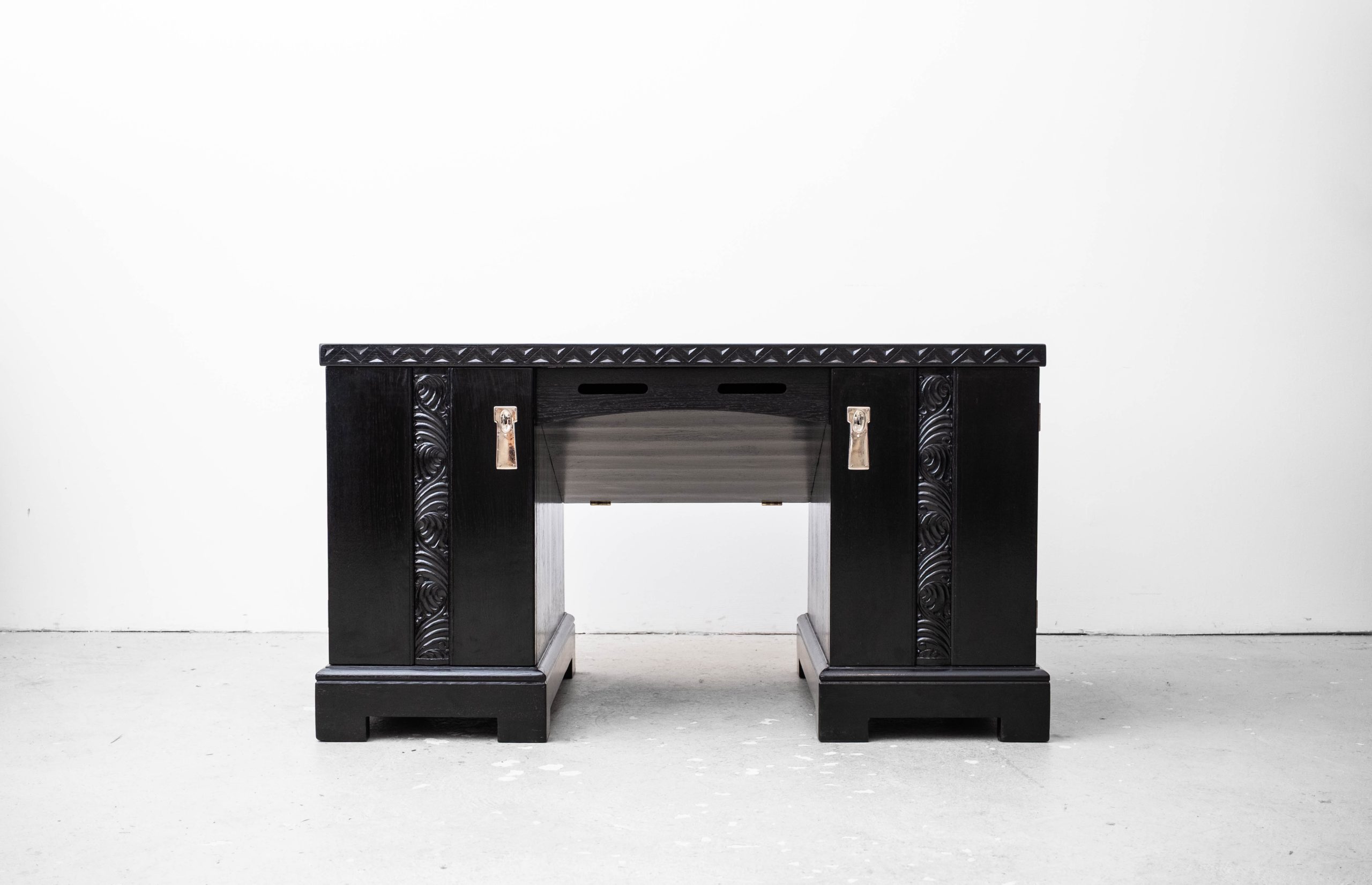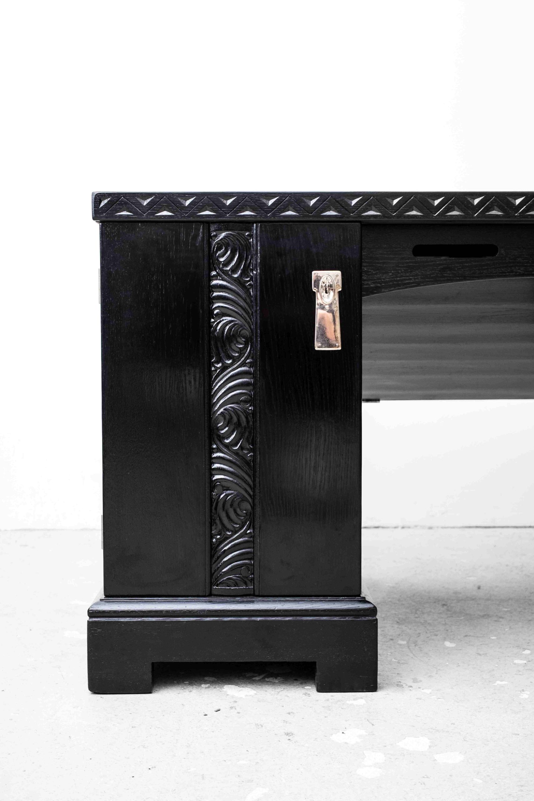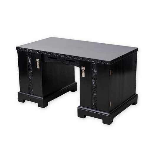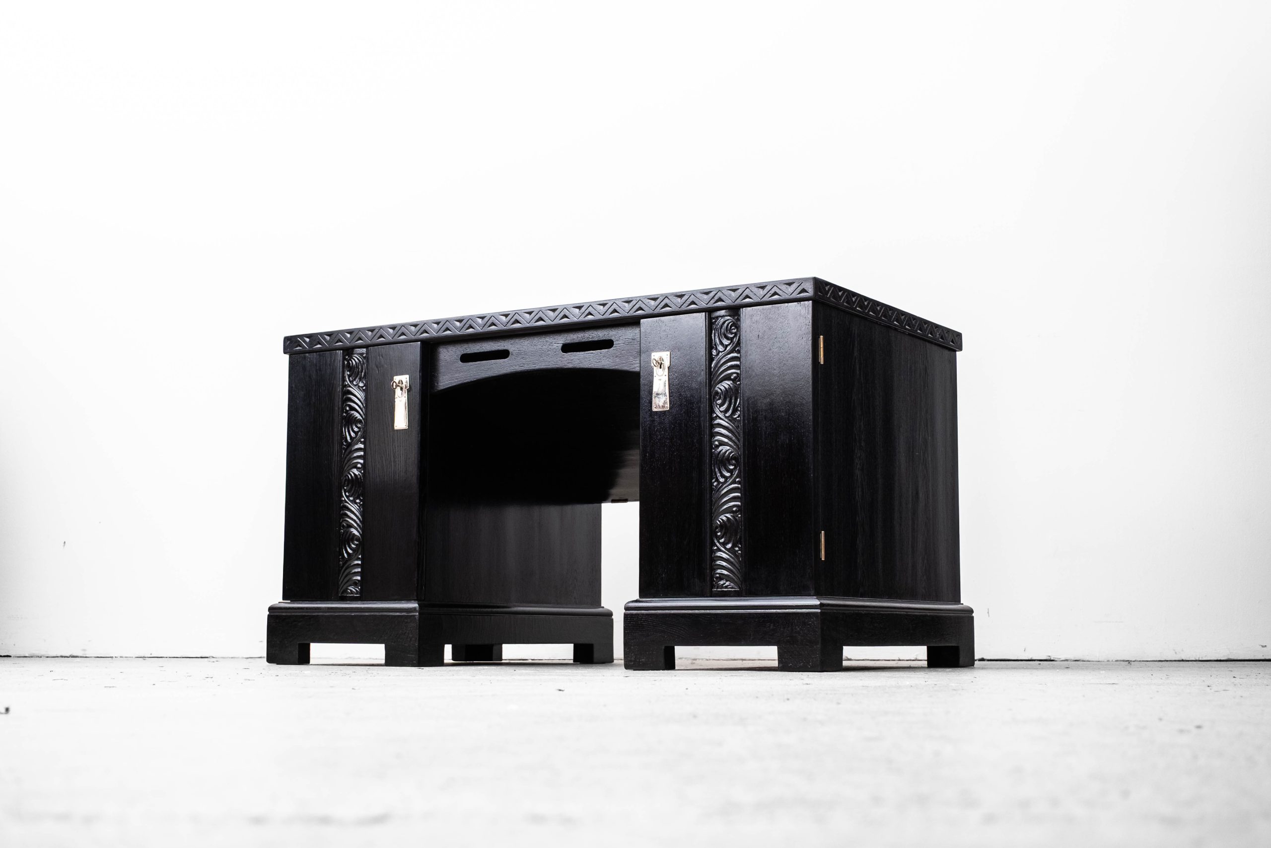 This desk exemplifies the clean lines and decorative precision characteristic of the Hoffmann school around 1910. Its strictly geometric structure is complemented by finely executed, partly organic carvings and high-quality alpaca silver hardware.