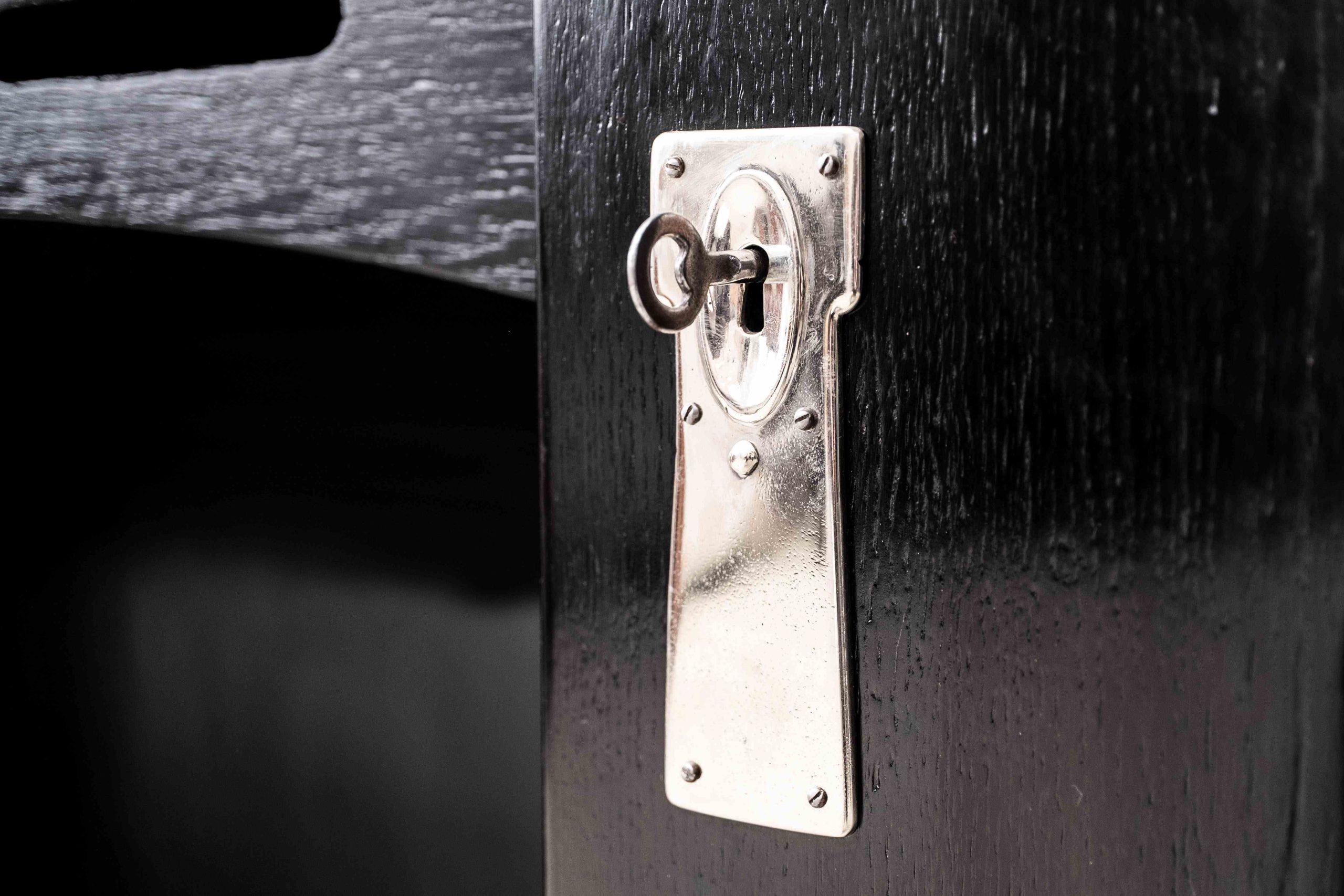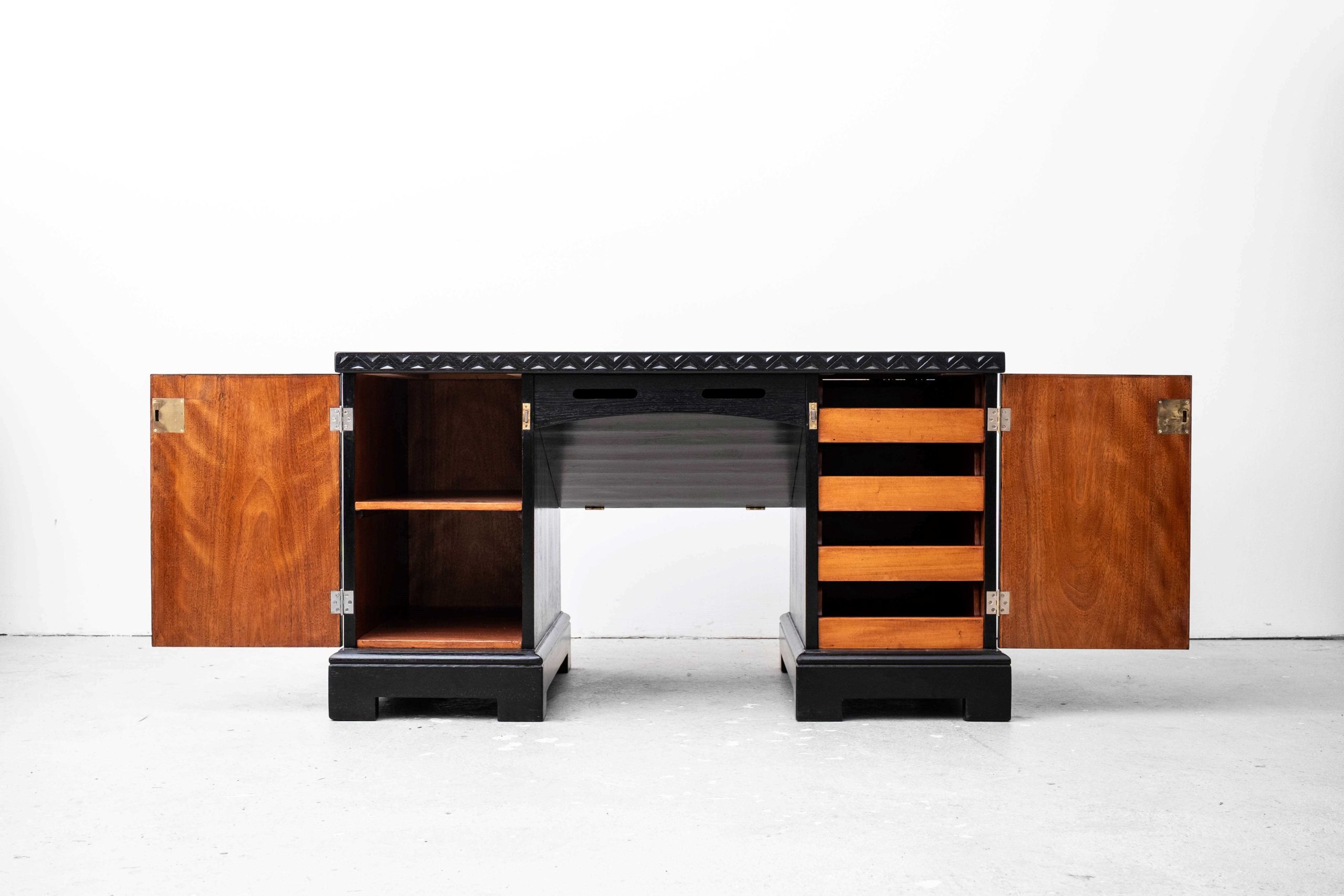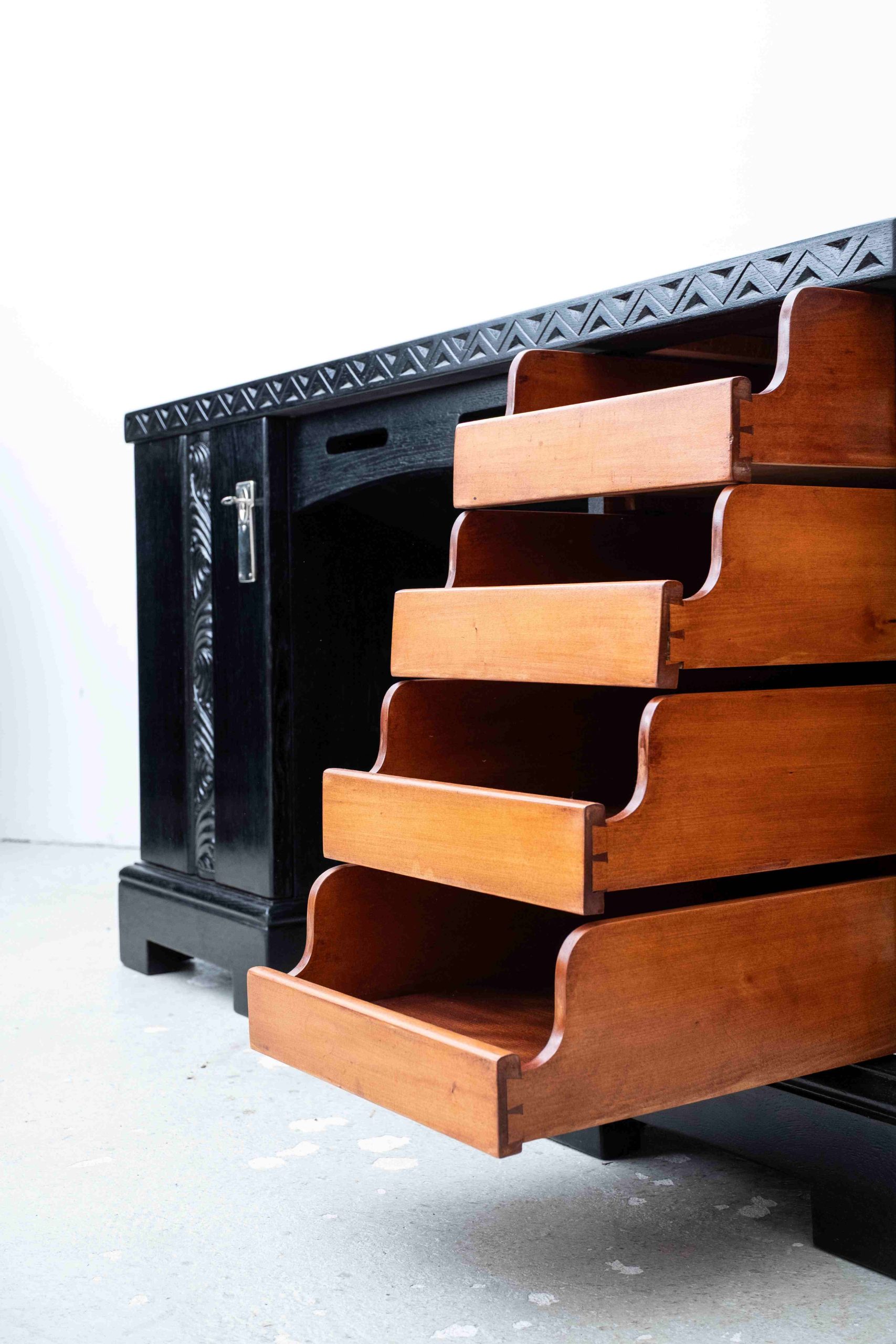 This desk exemplifies the clean lines and decorative precision characteristic of the Hoffmann school around 1910. Its strictly geometric structure is complemented by finely executed, partly organic carvings and high-quality alpaca silver hardware.