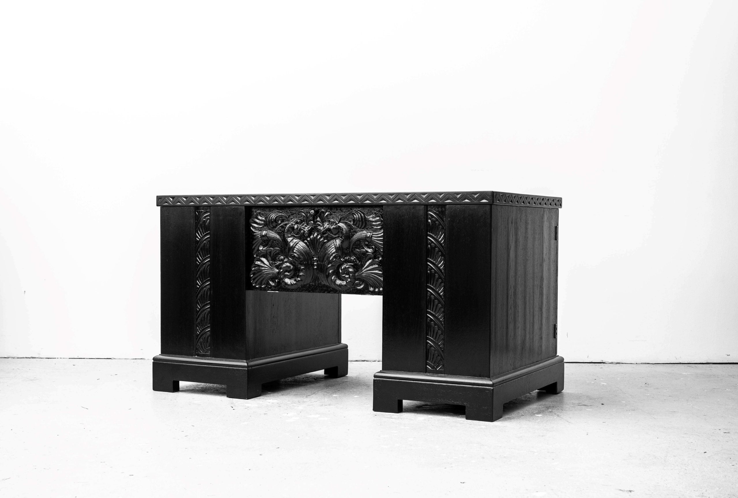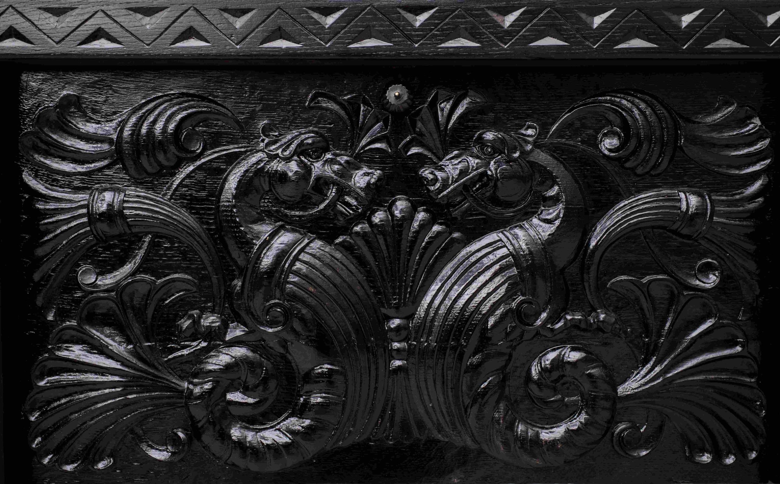 As a freestanding piece of furniture, it is designed to be impressive from every angle. The back features a fold-out letter tray, whose floral seahorse ornamentation underscores the quality of the detailing.