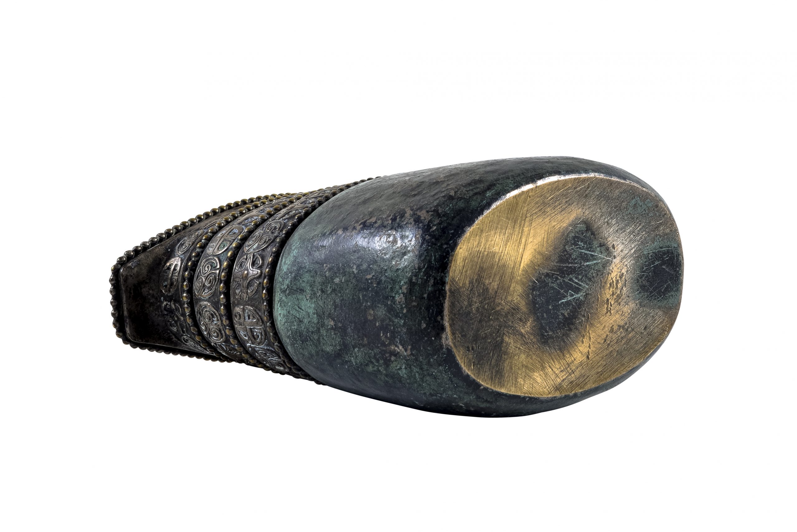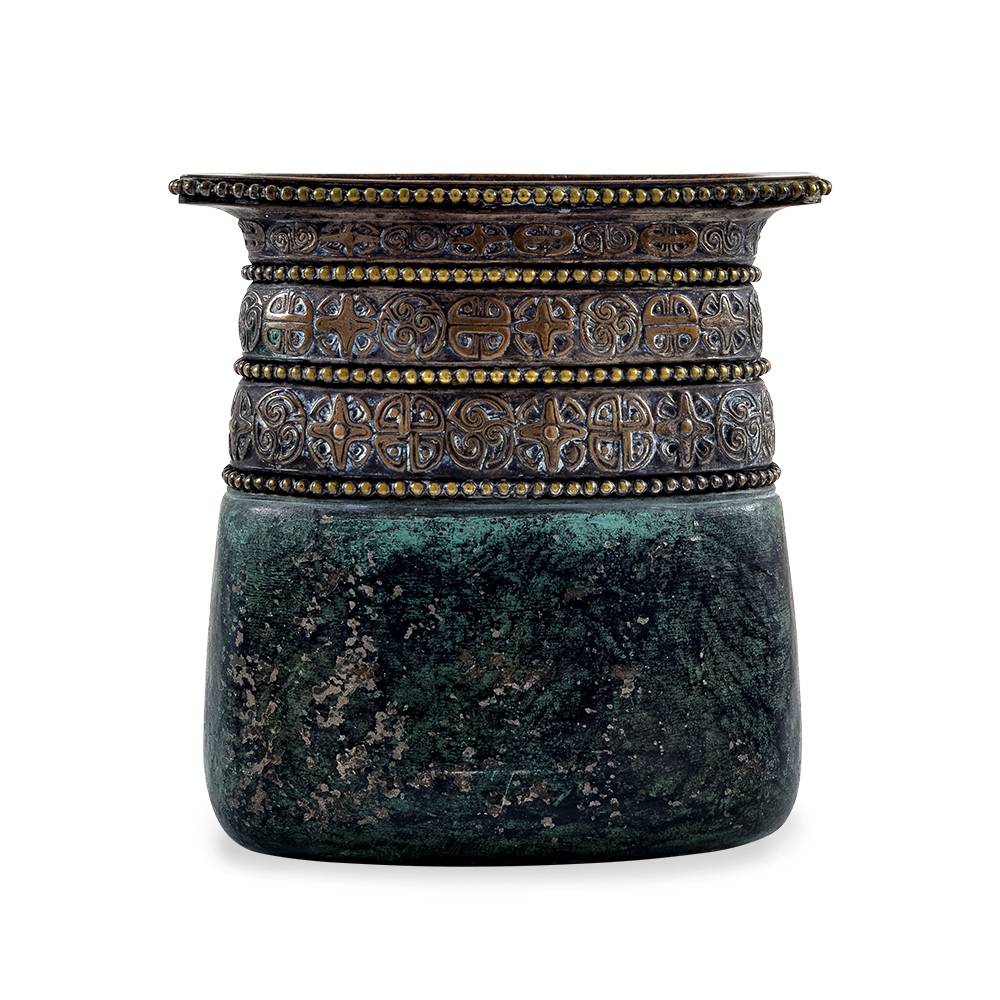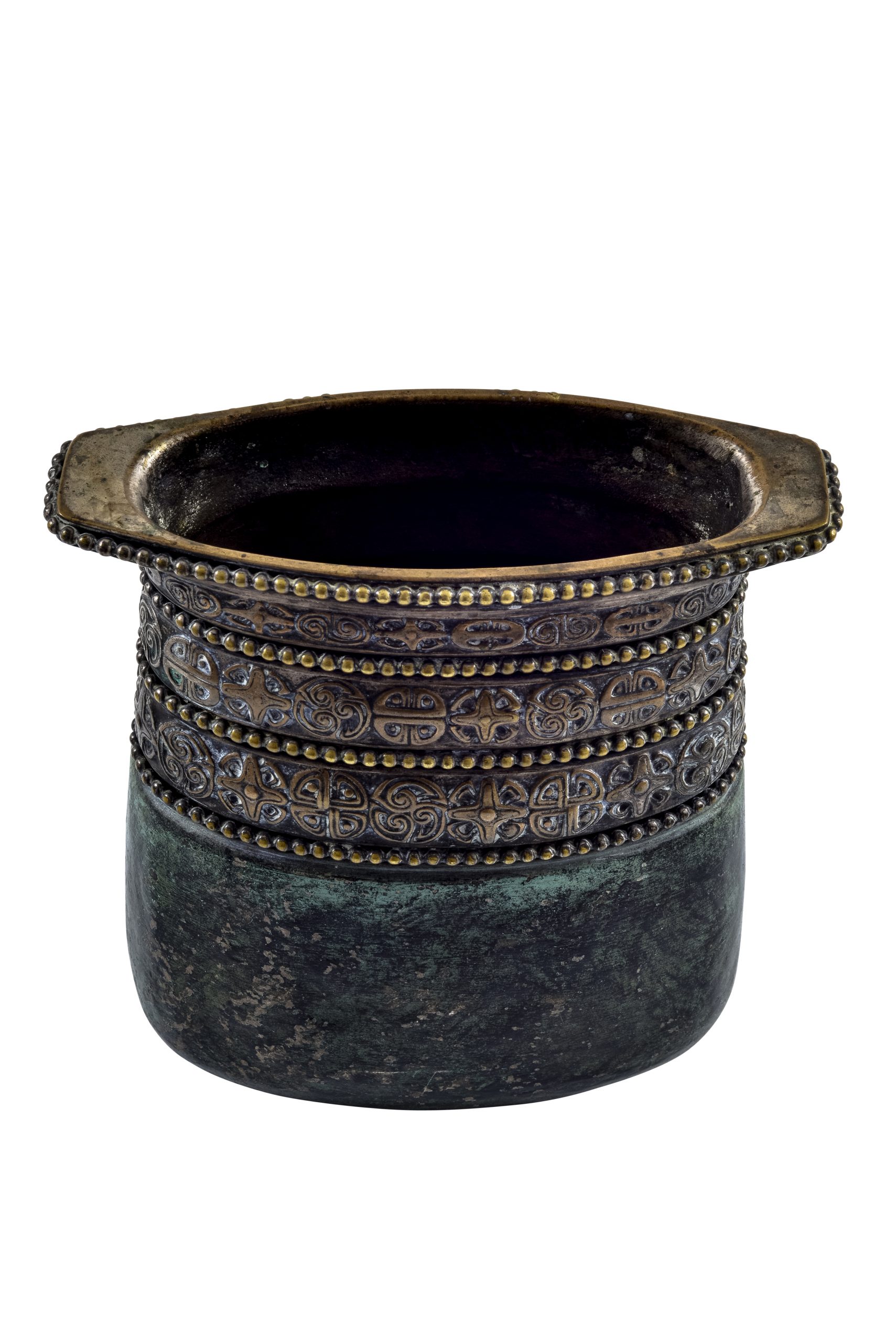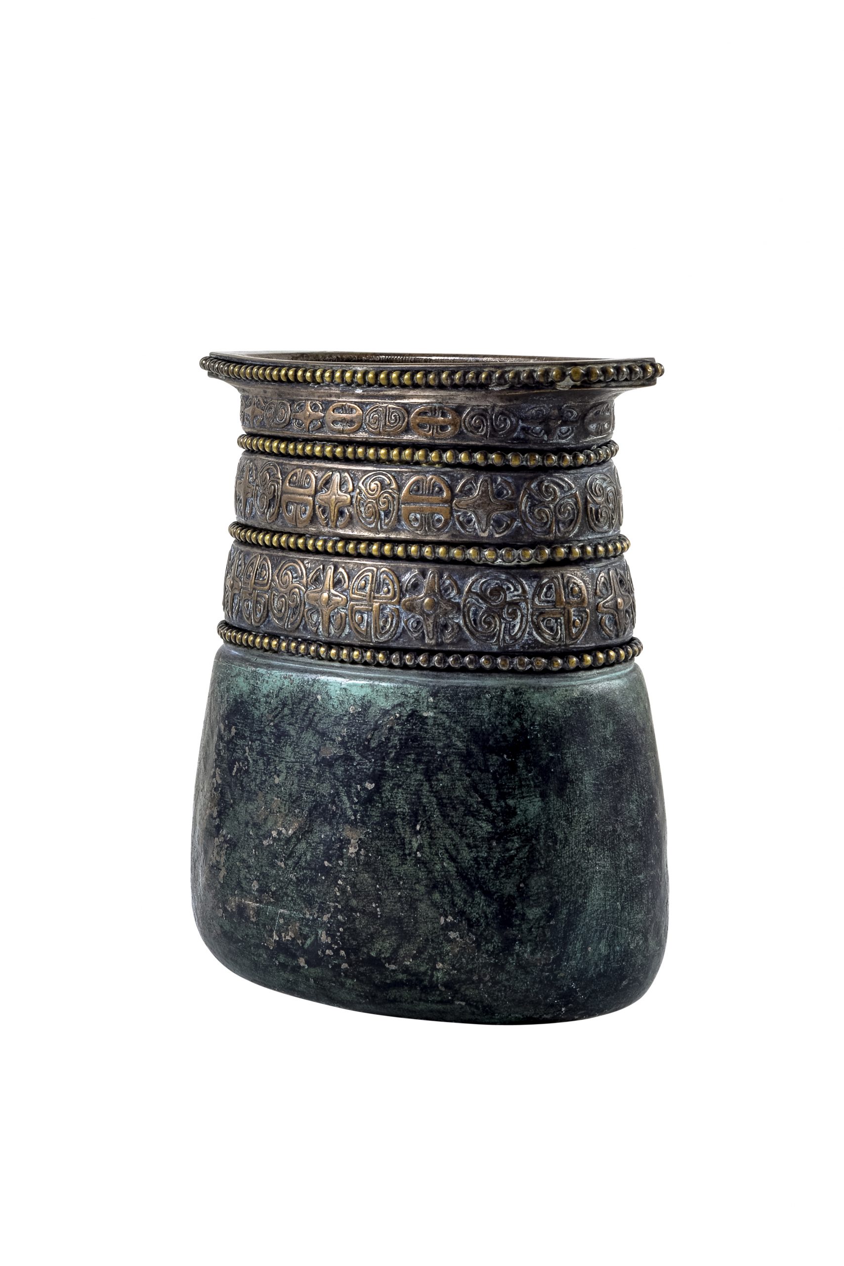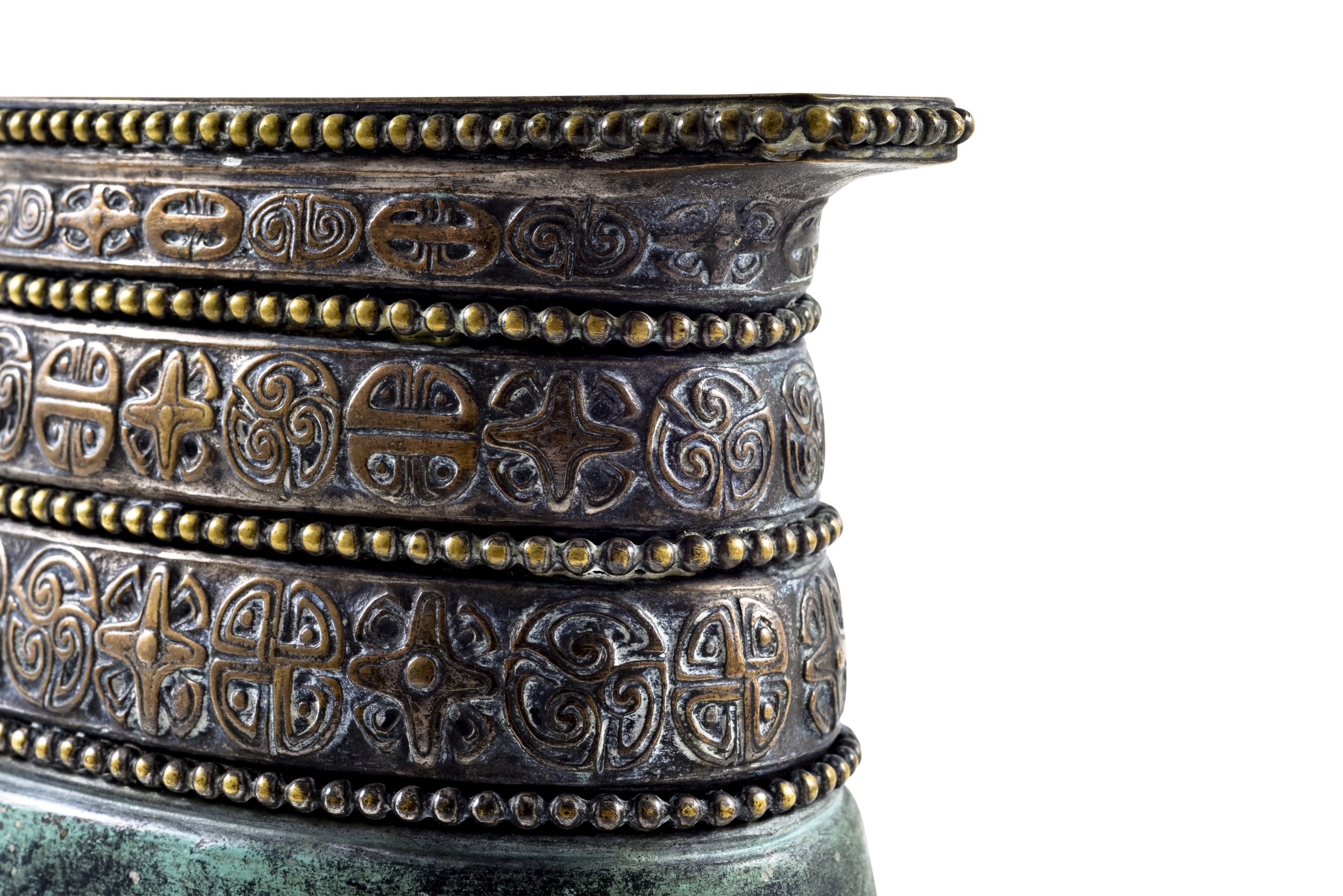 Dieses Bronzegefäß ist ein weiteres typisches Beispiel für eine Gurschner-Vase. Man erkennt auf der oberen Hälfte der Vase drei umlaufende Reliefbordüren mit diversen keltischen Knotenmustern, Triskelen und Schleifenquadraten.
