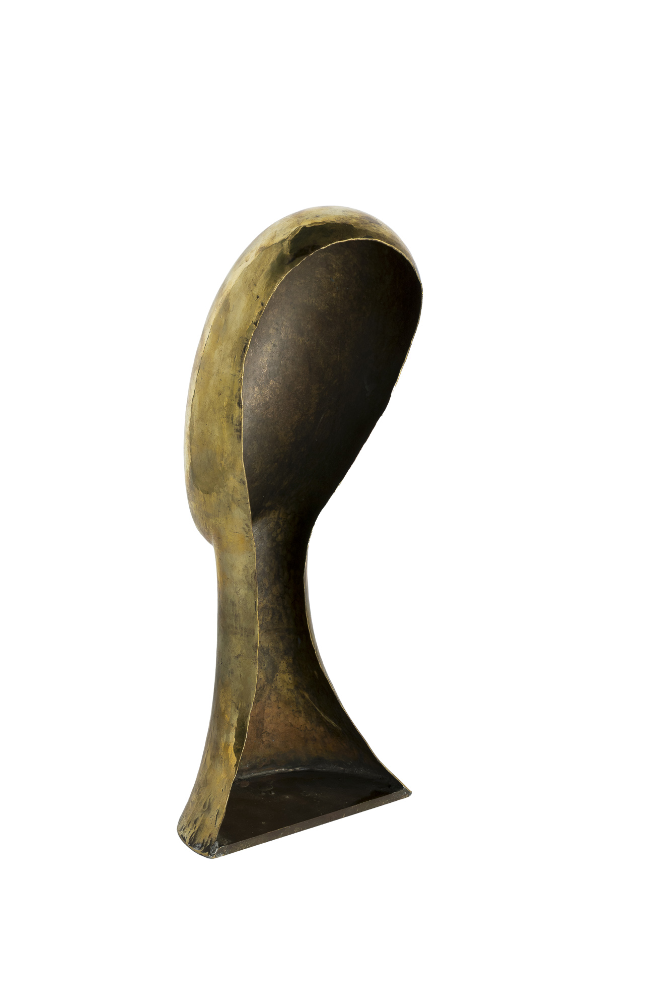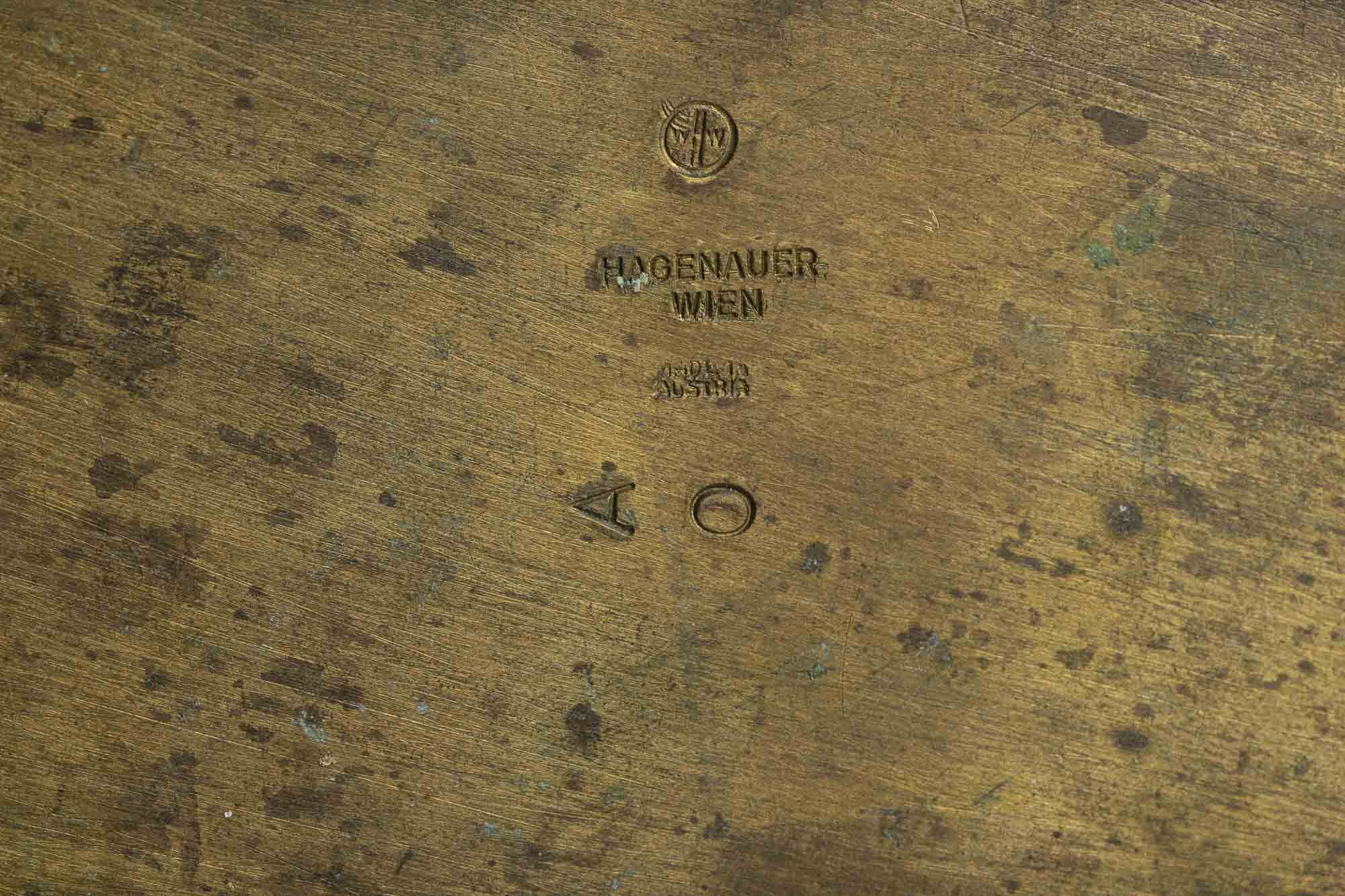 Diese 37 cm große Hagenauer Kopfskulptur wurde aus einem einzelnen Stück Messing gefertigt und auf eine markierte Bodenplatte gelötet. Nur die besten Metallkünstler der Werkstätte Hagenauer Wien waren in der Lage, ein Werk aus nur einem einzelnen Stück Metall zu schaffen. Die Initialen des ausführenden Mitarbeiters Anton Oppawa sind neben den Firmenmarken ebenfalls auf der Plinthe zu finden. Eine hohe interne Anerkennung, die nur die Objekte erhielten, die als besonders gut gelungen erachtet wurden. Das Design zu unserer Kopfskulptur gab es in unterschiedlichen Ausführungen, beispielsweise mit Locke, und in unterschiedlichen Größen, wobei unser sehr reduziertes Exemplar besonders selten ist.