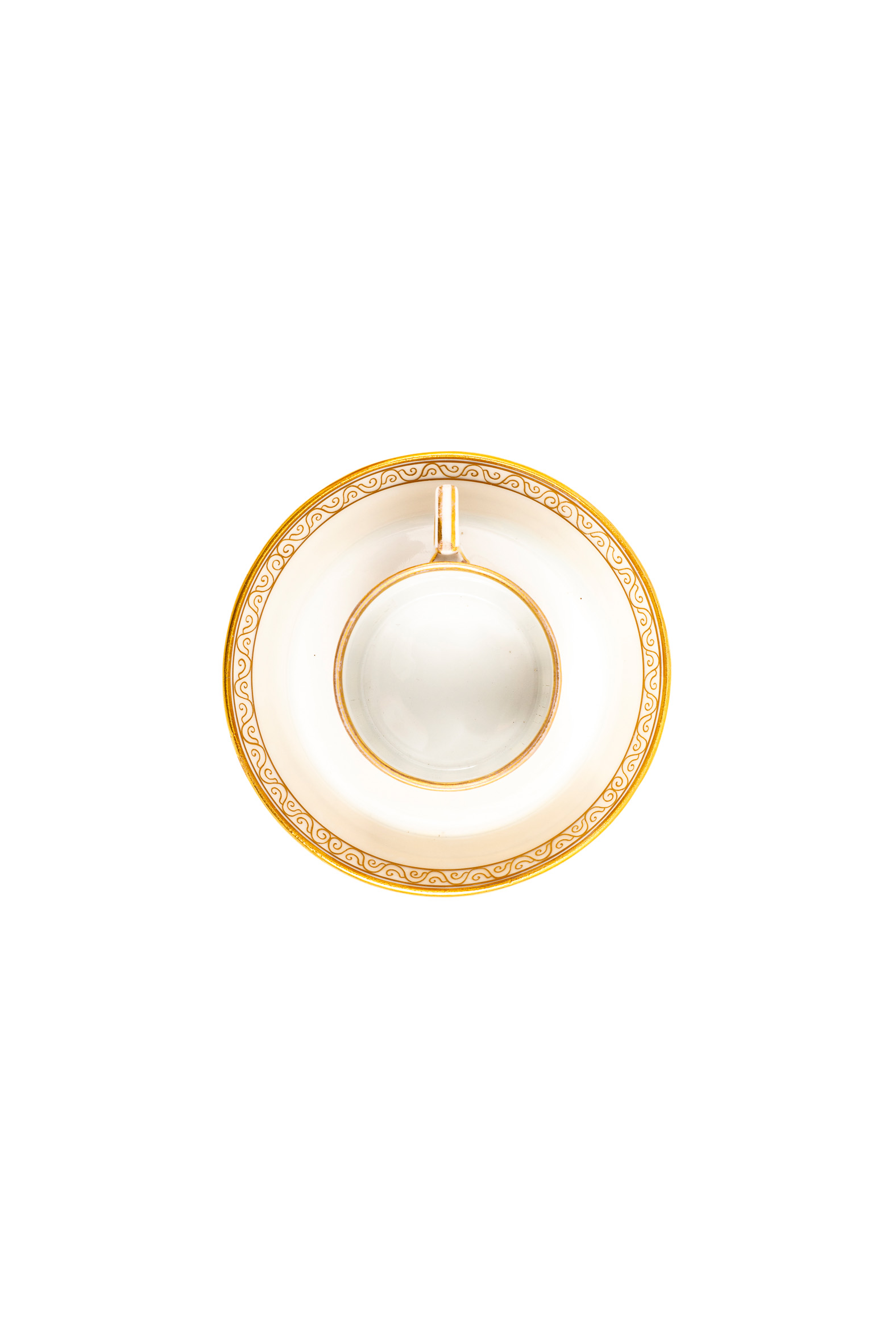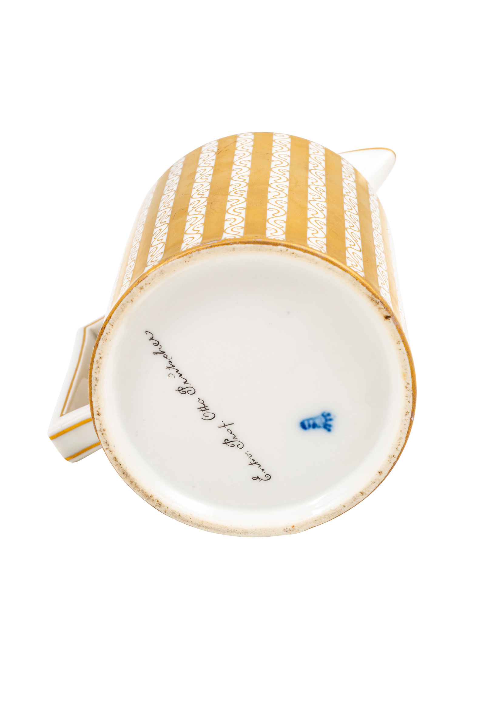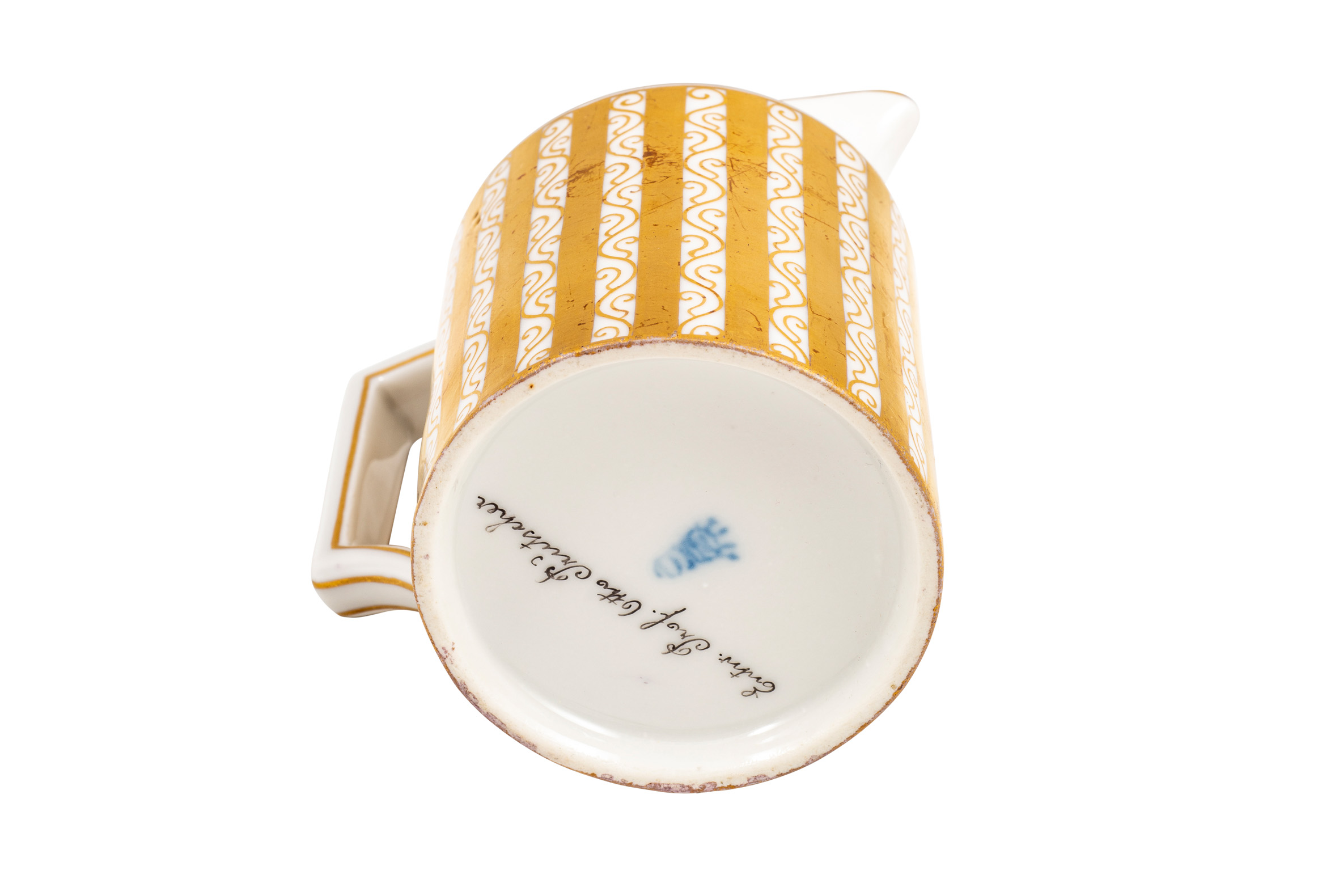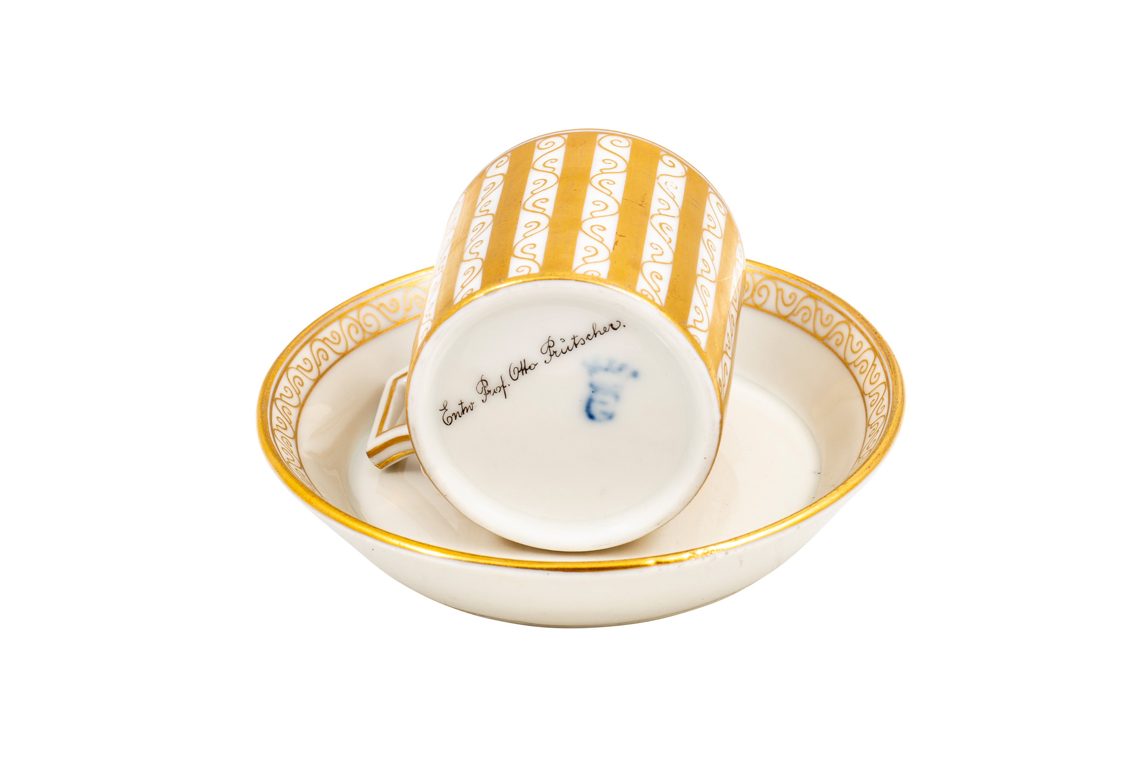 Seine künstlerische Vision – die Betonung der Form mithilfe des Dekors – geht auch hier Hand in Hand mit einem gelungenen Spiel aus Vertikal- und Horizontalstreifen in Verbindung mit ornamentalen Motiven. Die Form „Calais“, welche bereits in der alten Wiener Porzellanmanufaktur besonders beliebt war, erlebte durch Prutschers ästhetischen Dekorentwurf in strahlendem Gold eine Renaissance. Der augenscheinliche Qualitätsanspruch dieses seltenen Service wird neben Otto Prutschers Signatur auch durch jene der renommierten Porzellanmanufaktur Ernst Wahliss besiegelt. Darüber hinaus wurde das Mokkaservice im Jahr 1916 auf der Stockholmer Kunst- und Modeausstellung präsentiert.