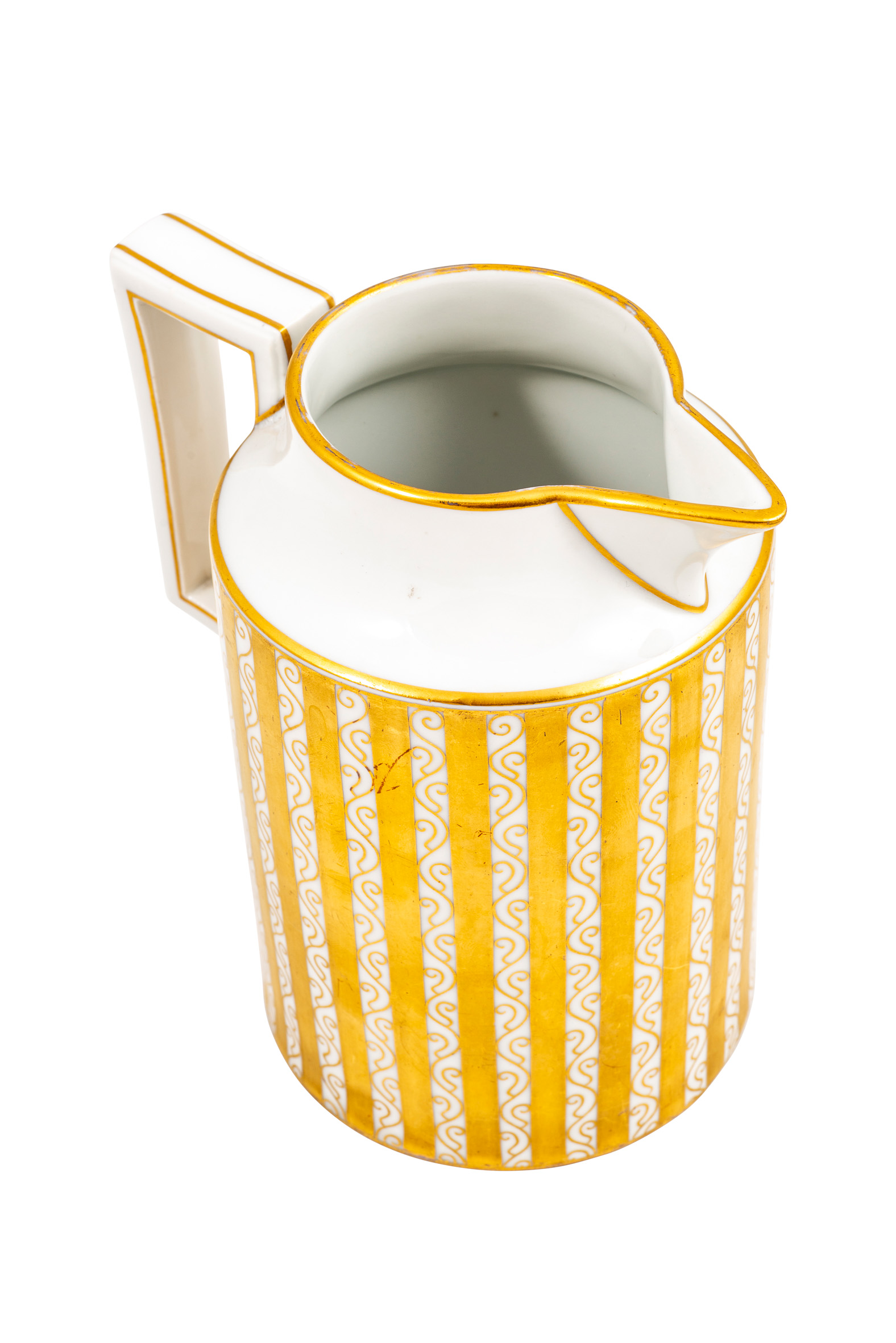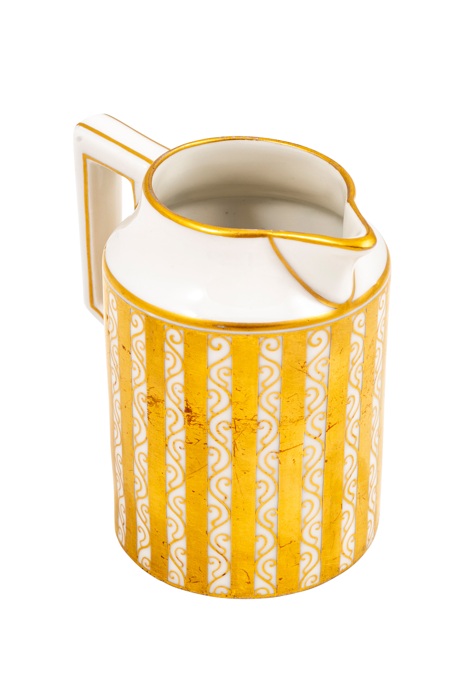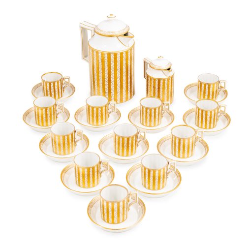 Der hohe künstlerische Anspruch Otto Prutschers an seine eigenen Entwürfe zeigt sich besonders repräsentativ an diesem Mokkaservice. Das exzellent erhaltene Service, bestehend aus zwölf Tassen, einer großen Kanne sowie einem kleinen Milchkännchen, ist ein Paradebeispiel für den Ideenreichtum des Architekten und Designers in Bezug auf die Gestaltung des Dekors, der Form und der Farbgebung.