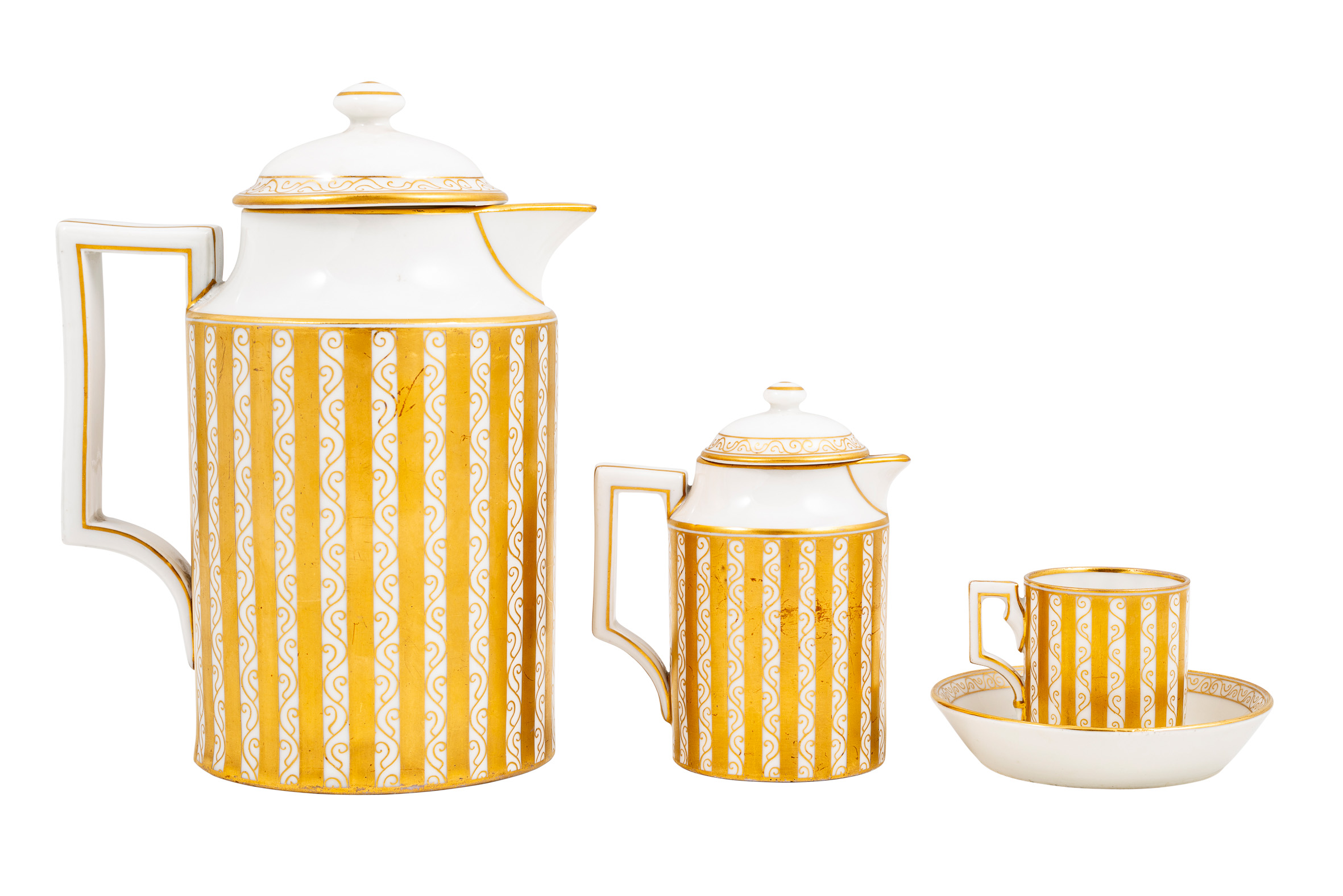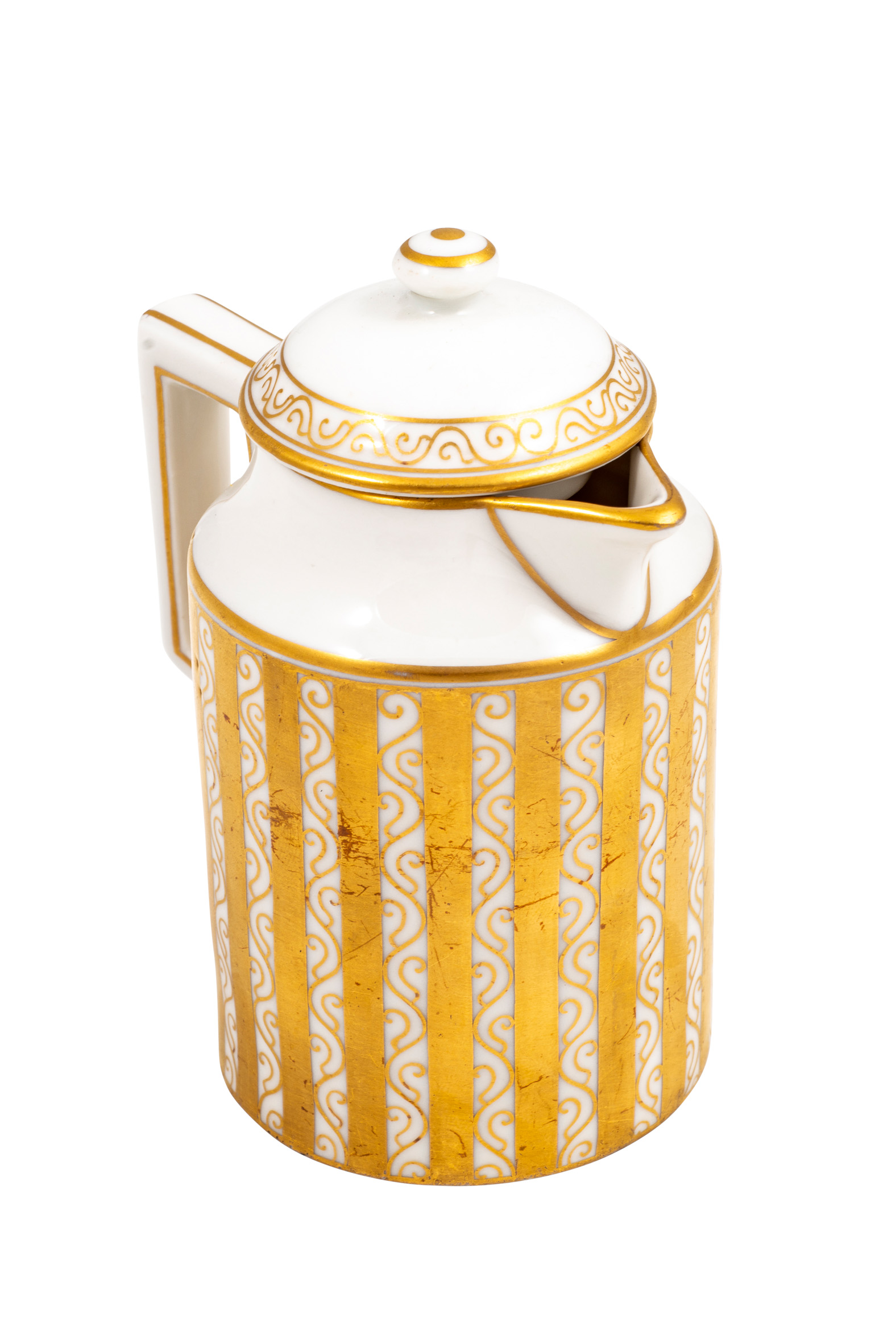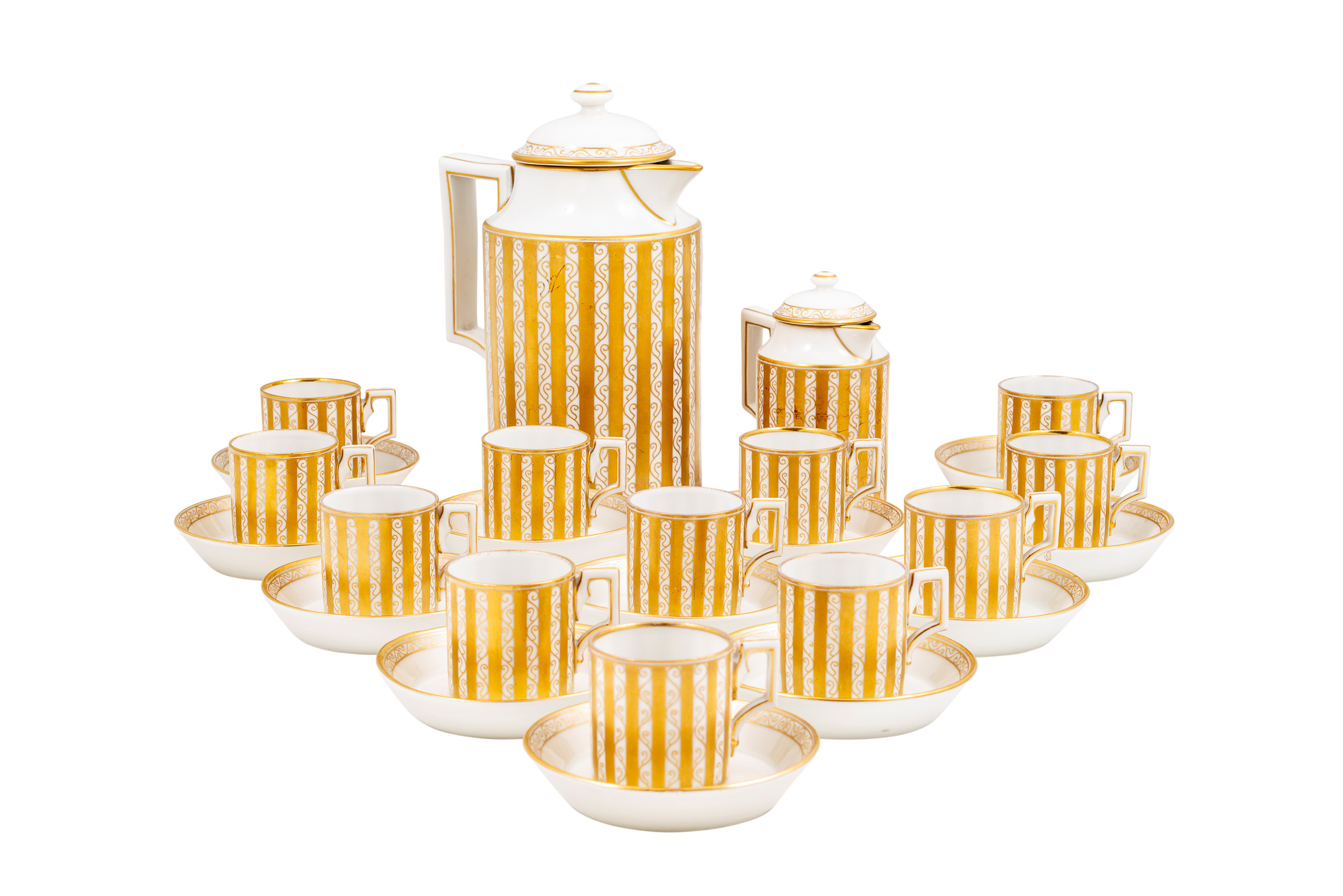 Der hohe künstlerische Anspruch Otto Prutschers an seine eigenen Entwürfe zeigt sich besonders repräsentativ an diesem Mokkaservice. Das exzellent erhaltene Service, bestehend aus zwölf Tassen, einer großen Kanne sowie einem kleinen Milchkännchen, ist ein Paradebeispiel für den Ideenreichtum des Architekten und Designers in Bezug auf die Gestaltung des Dekors, der Form und der Farbgebung.