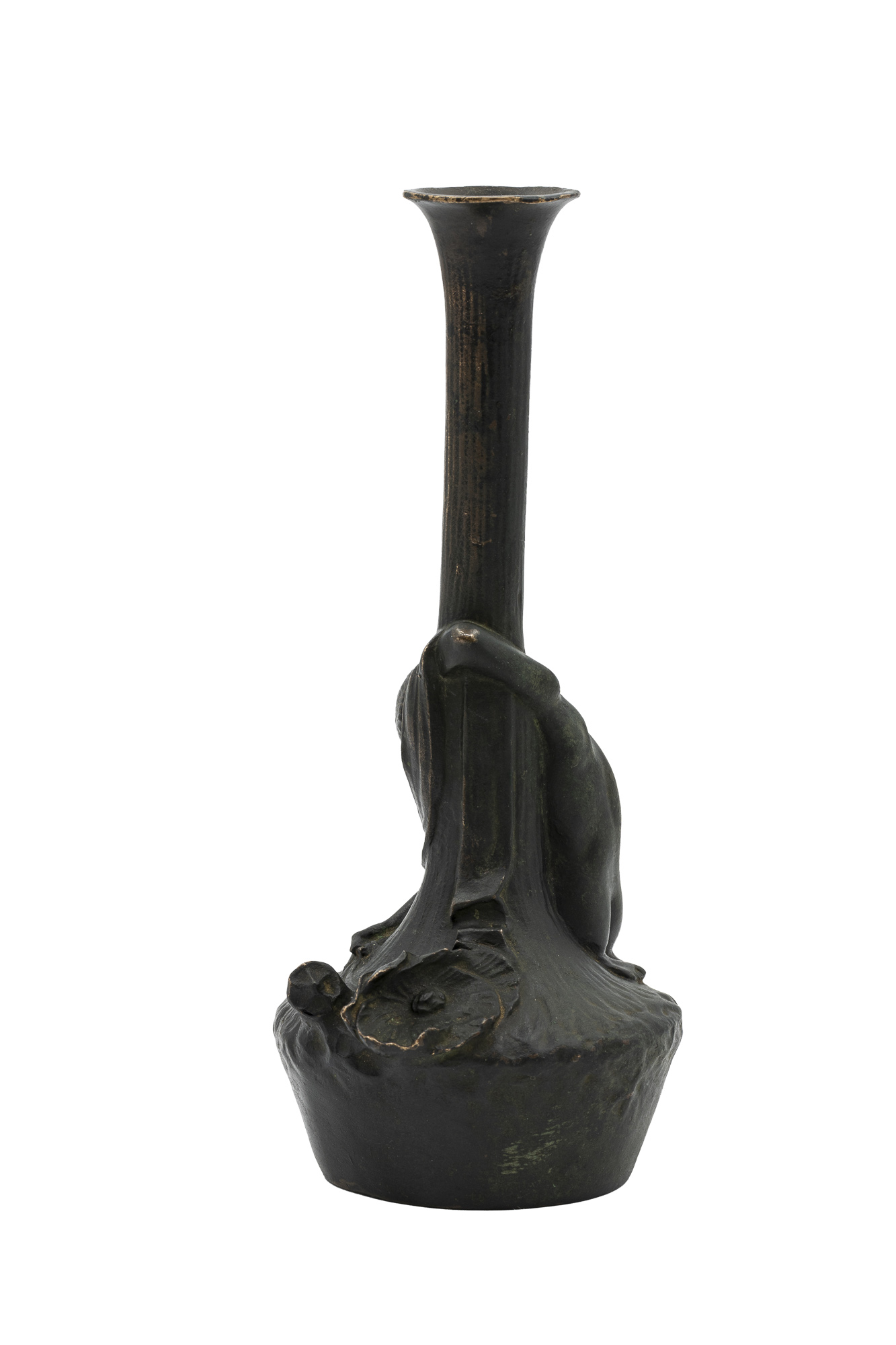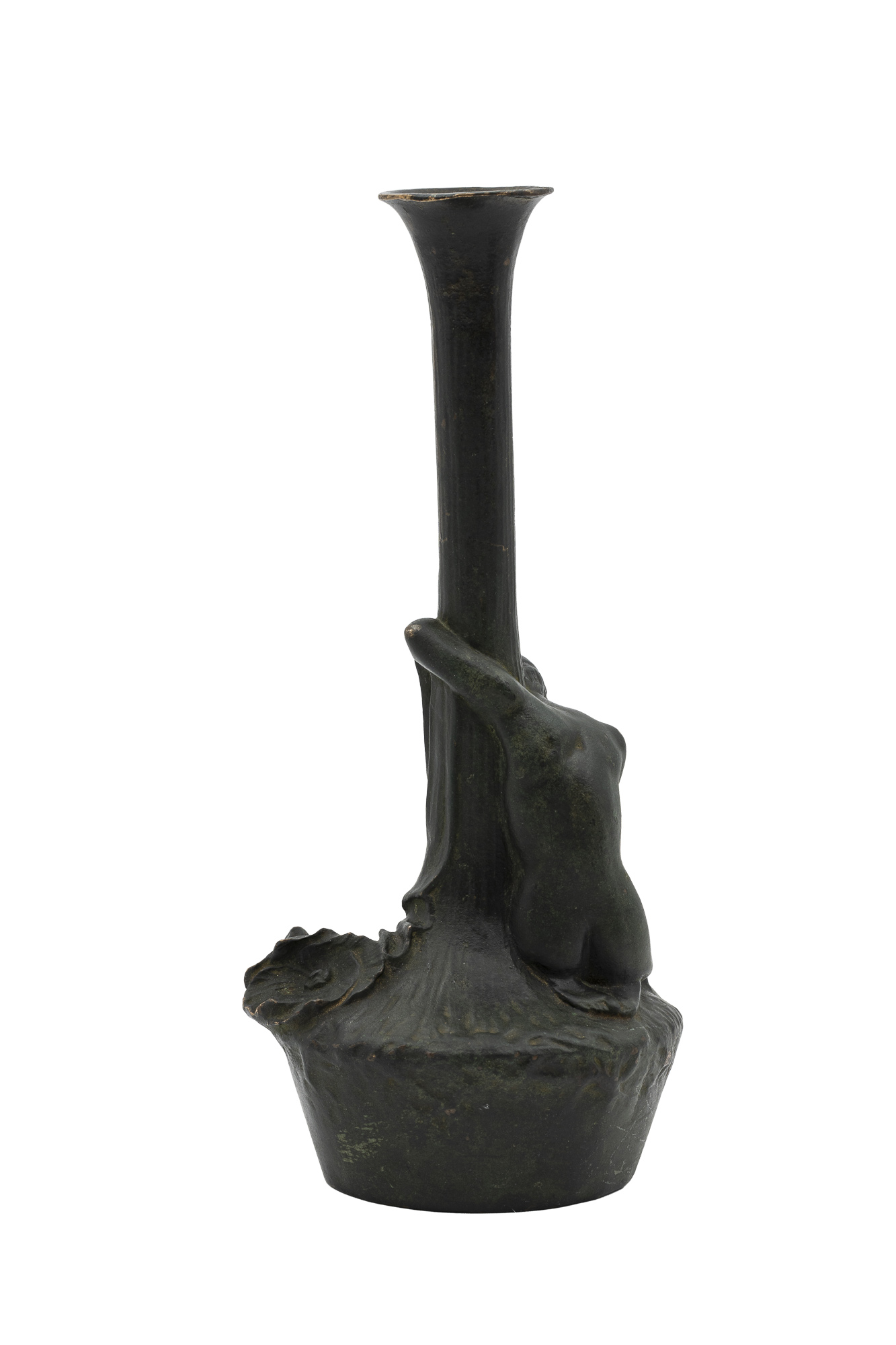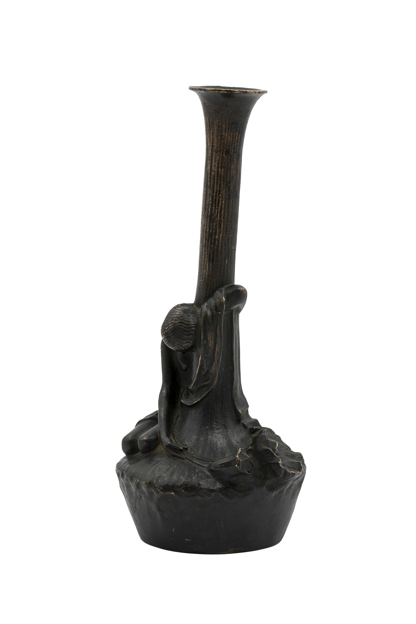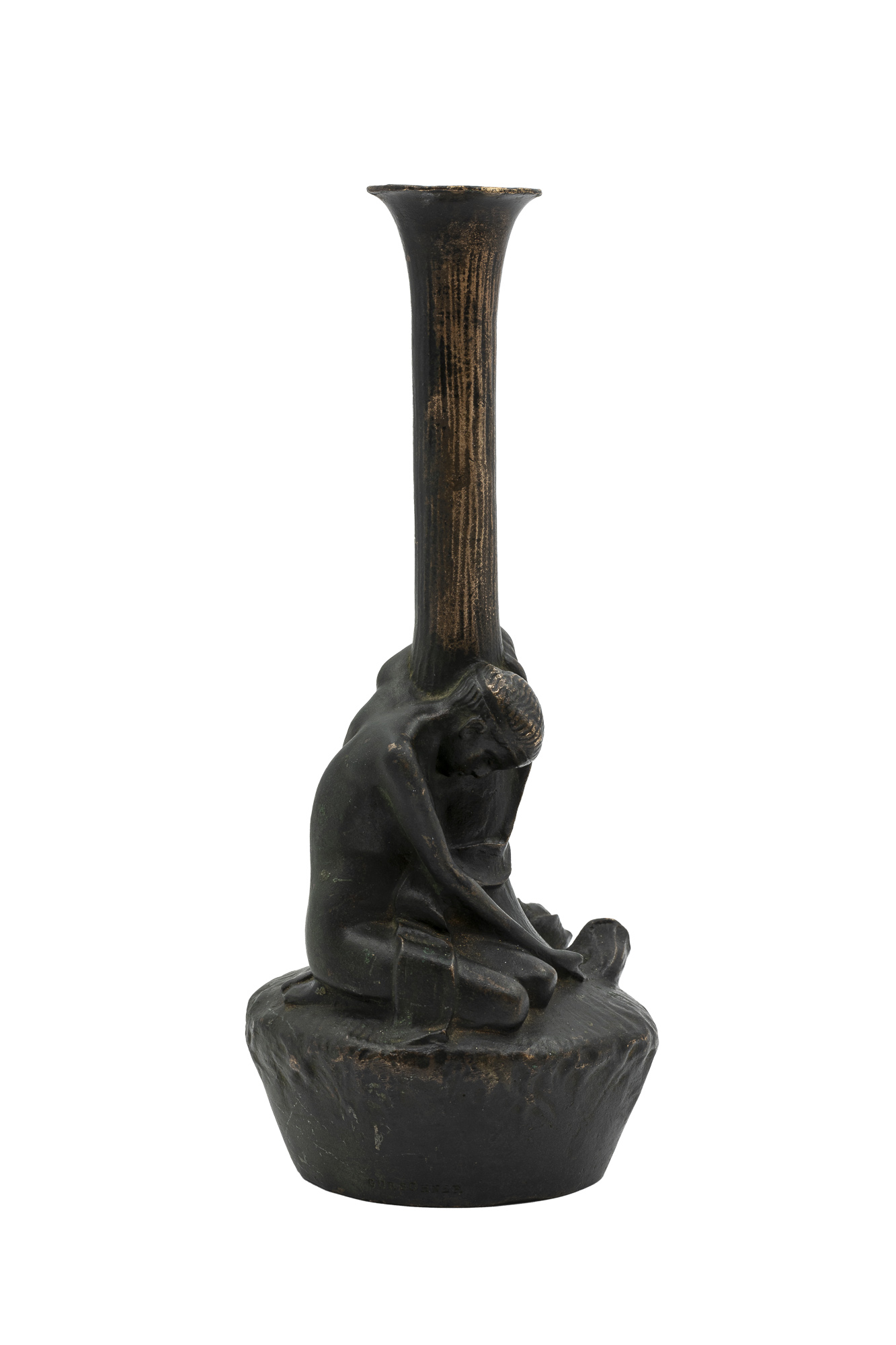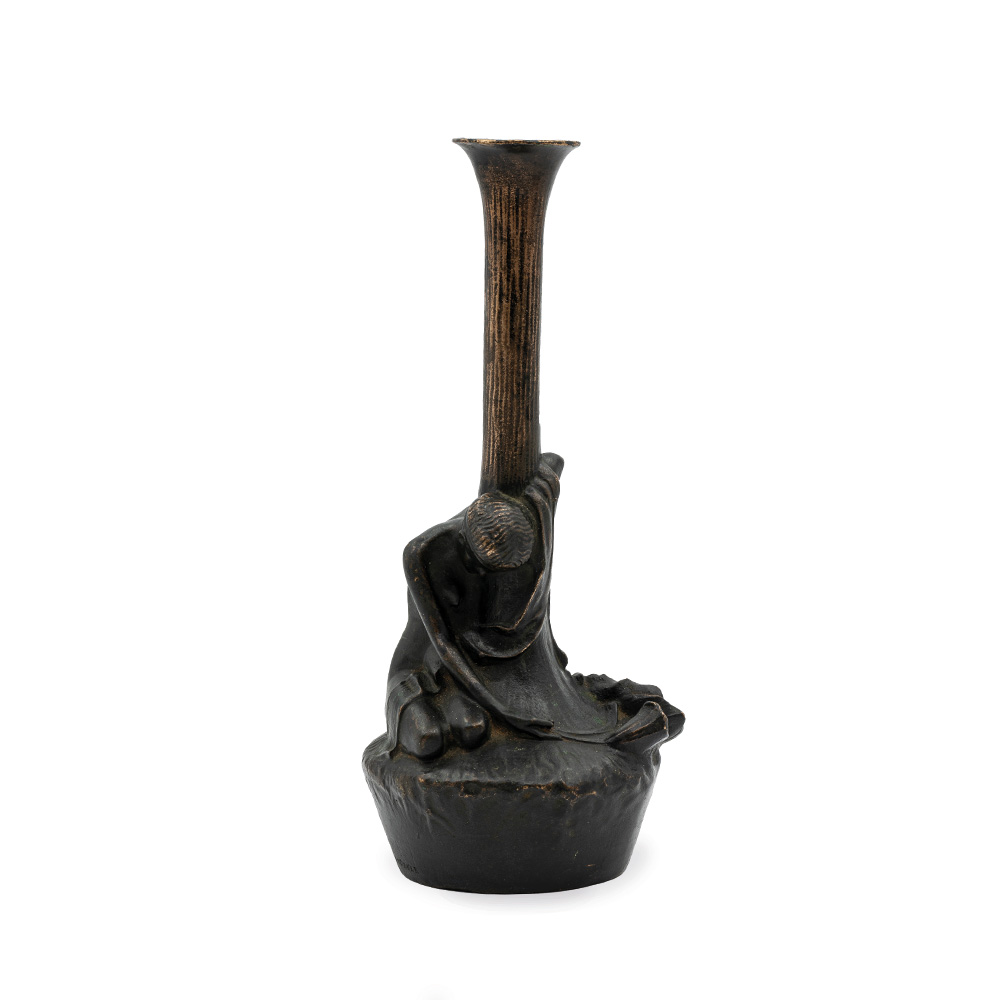 Dieser poetische Kerzenhalter, ein frühes Beispiel für Wiener Jugendstil-Bronze, zeigt eine liegende Figur, die sich sanft um den Kerzenhalter schmiegt und in einer Hand eine Mohnblume hält. Symbolik, Introspektion und subtile Erotik vereinen sich in einem Werk, das die traumhafte, introspektive Welt des Jugendstils widerspiegelt.