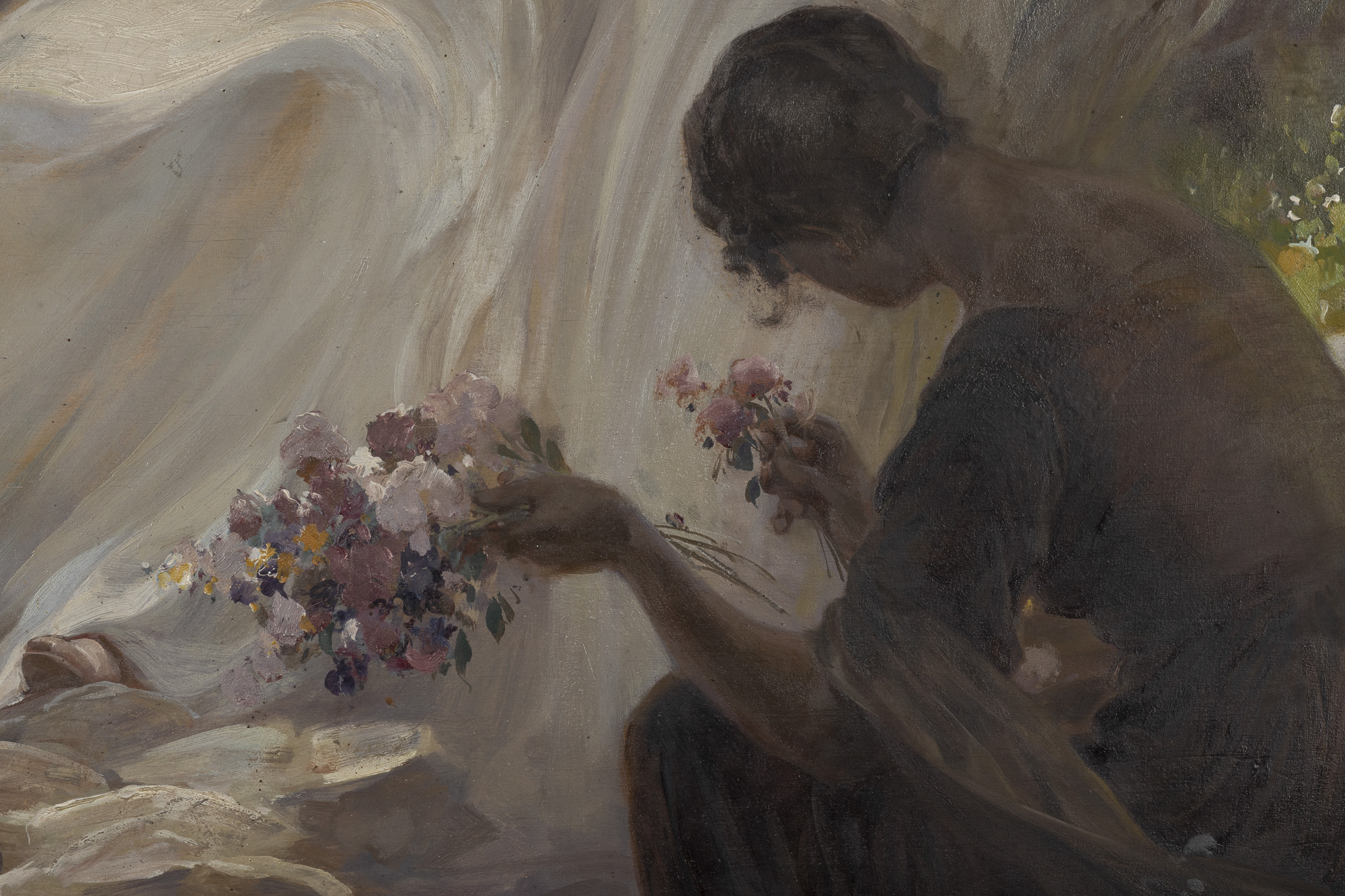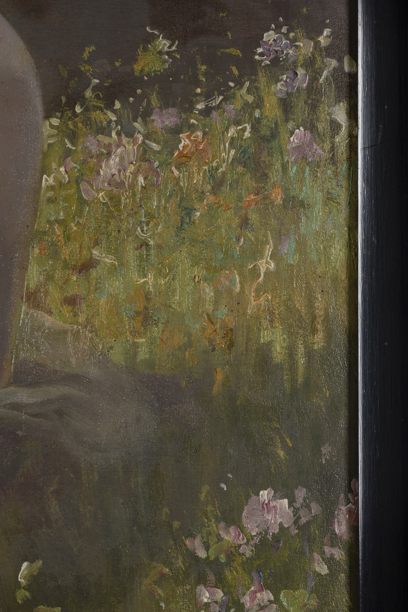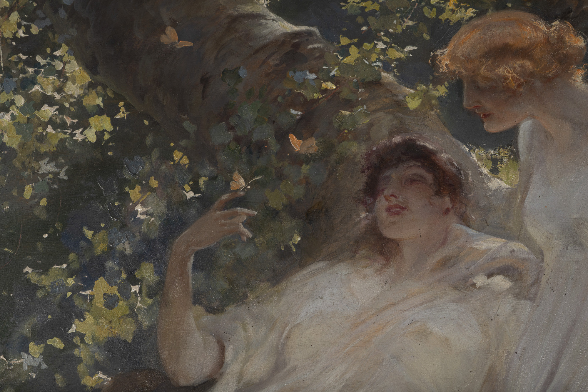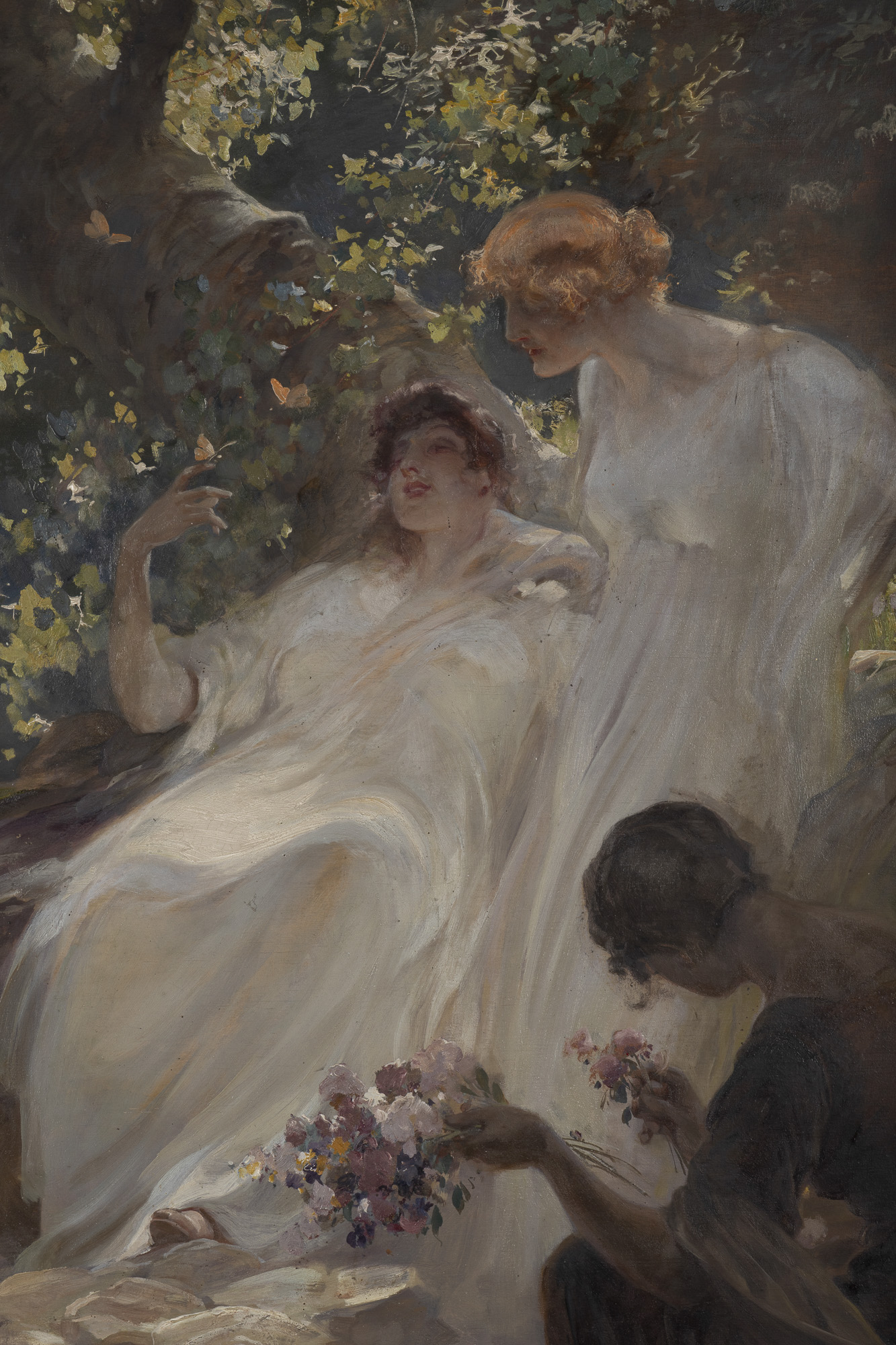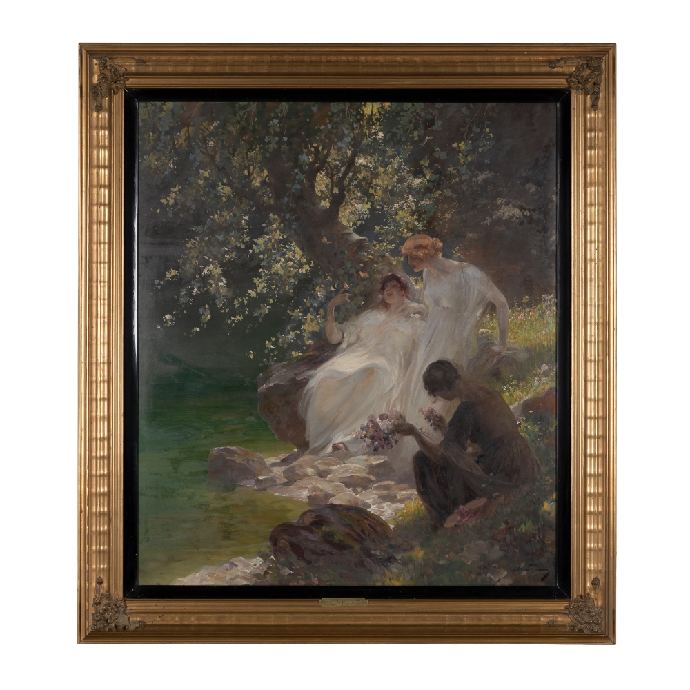 Unter dem dichten Blätterdach entfaltet sich eine stille, beinahe entrückte Uferszene: Drei Frauen ruhen am Wasser, umgeben von schimmerndem Grün und zart einfallendem Licht. Die weißen Gewänder und die fein gemalten Blumen verleihen der Komposition eine poetische, traumhafte Atmosphäre zwischen Naturidylle und allegorischer Erzählung.
