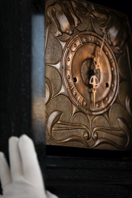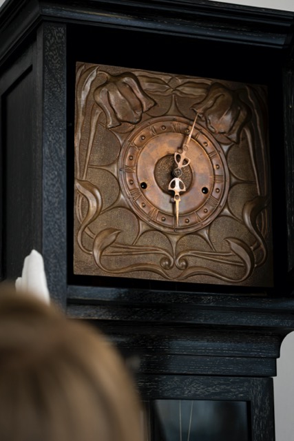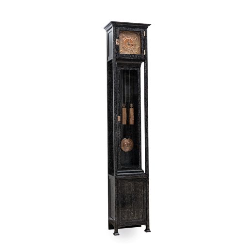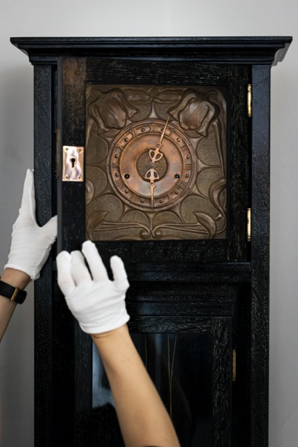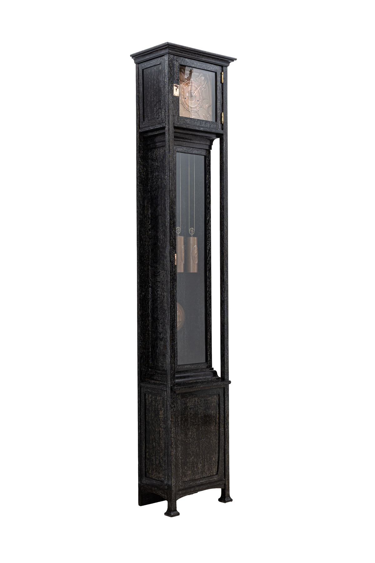 Die Metallarbeiten überzeugen durch Präzision, stilisierte Formen und harmonische Zurückhaltung. Die Uhr verfügt über ein Monatswerk und gongt halbstündlich. Ein beispielhaftes Zusammenspiel von Technik, Design und künstlerischem Anspruch.