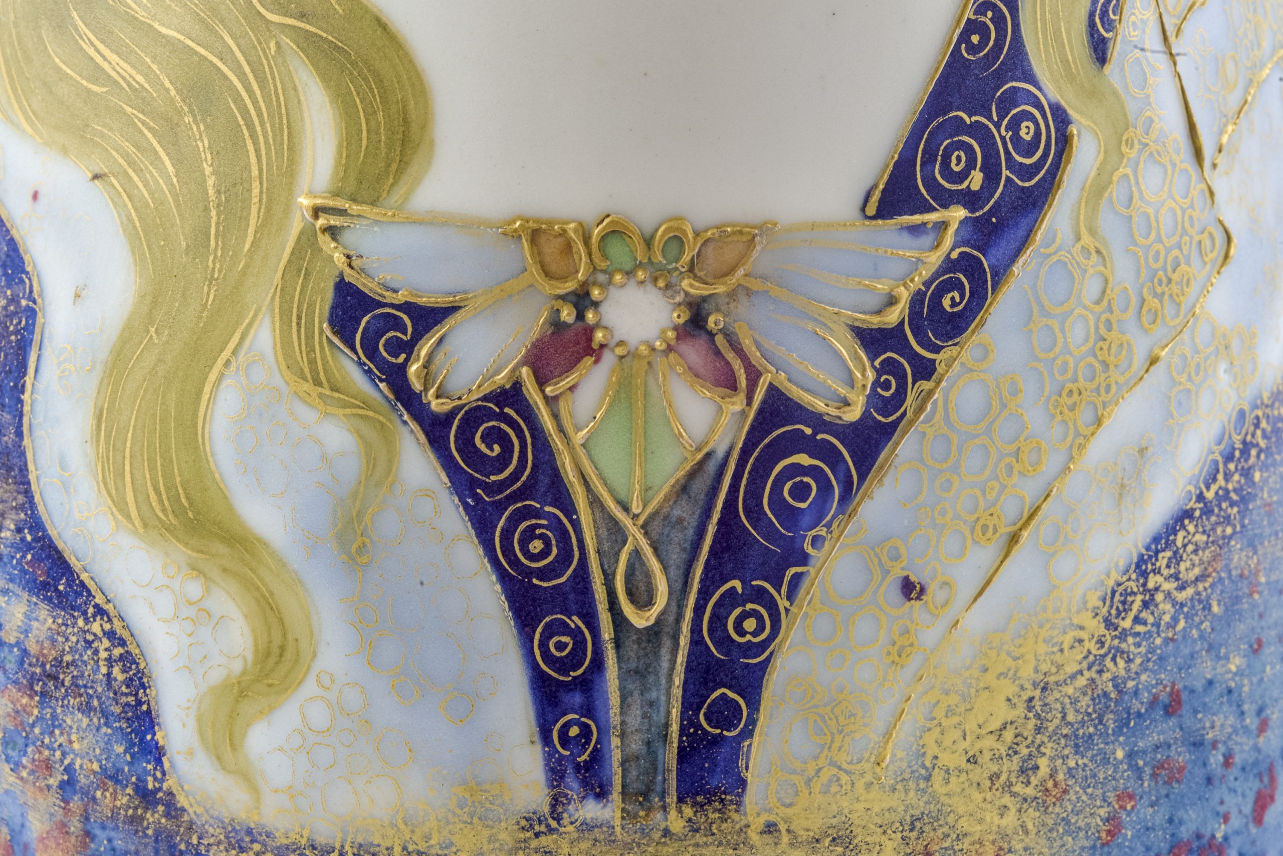 Der Helm, den die Dame auf der Schauseite der großen Vase trägt, ist mit dem gallischen Hahn geschmückt. Das stolze und kampfbereite Tier symbolisiert Frankreich und mit diesem Attribut ist die streitbare Kriegerin als Allegorie Frankreichs deutlich zu erkennen. Ihre Prunkrüstung ist kunstvoll glasiert und aufwendig mit reliefartigen Applikationen geschmückt. Besonders fein ausgearbeitet ist die Ornamentik am Helm und am Schmetterling im Ausschnitt.