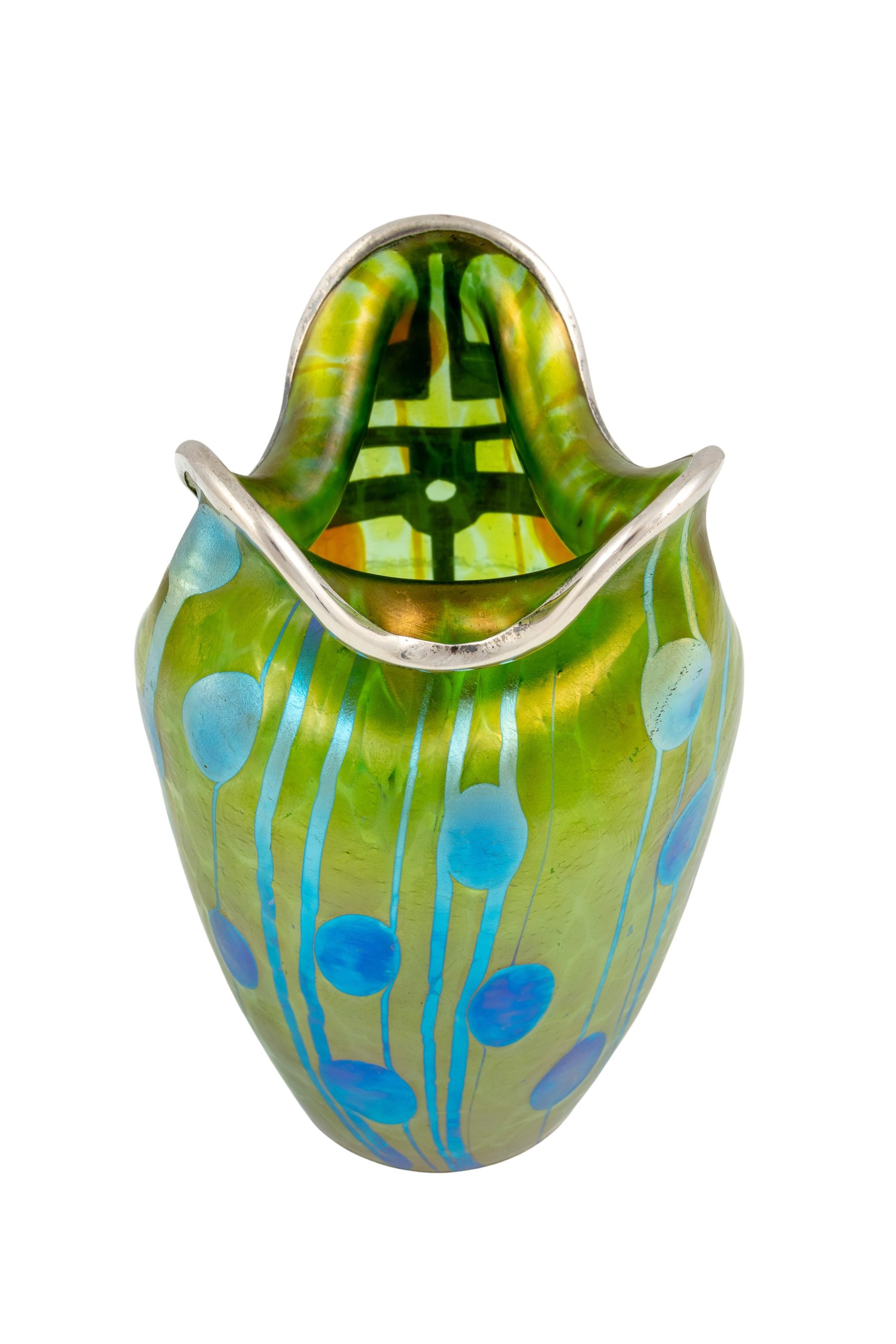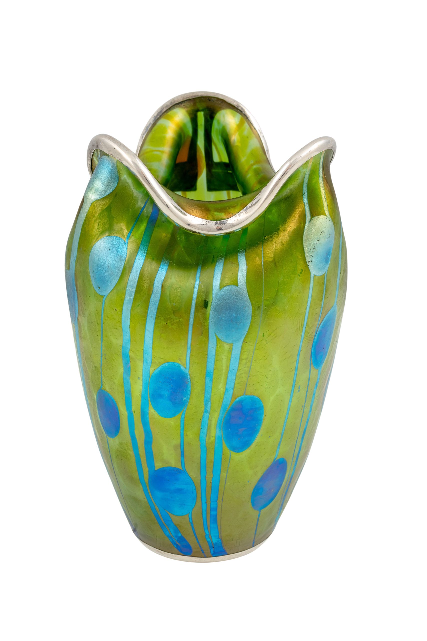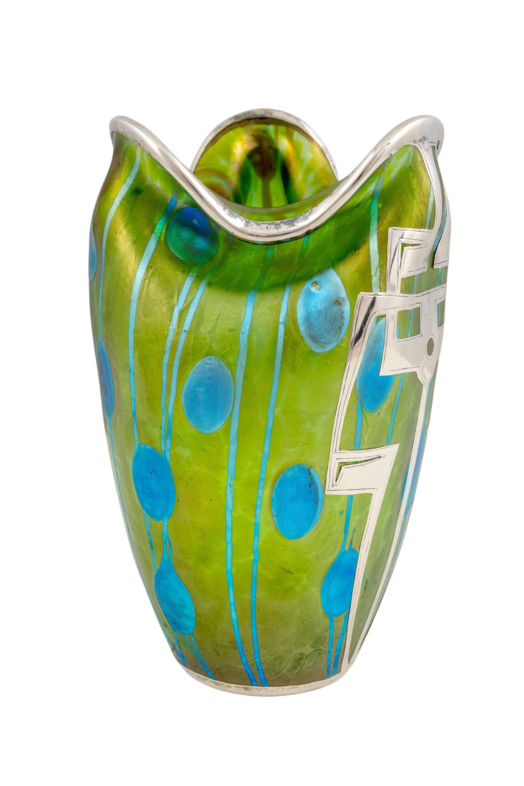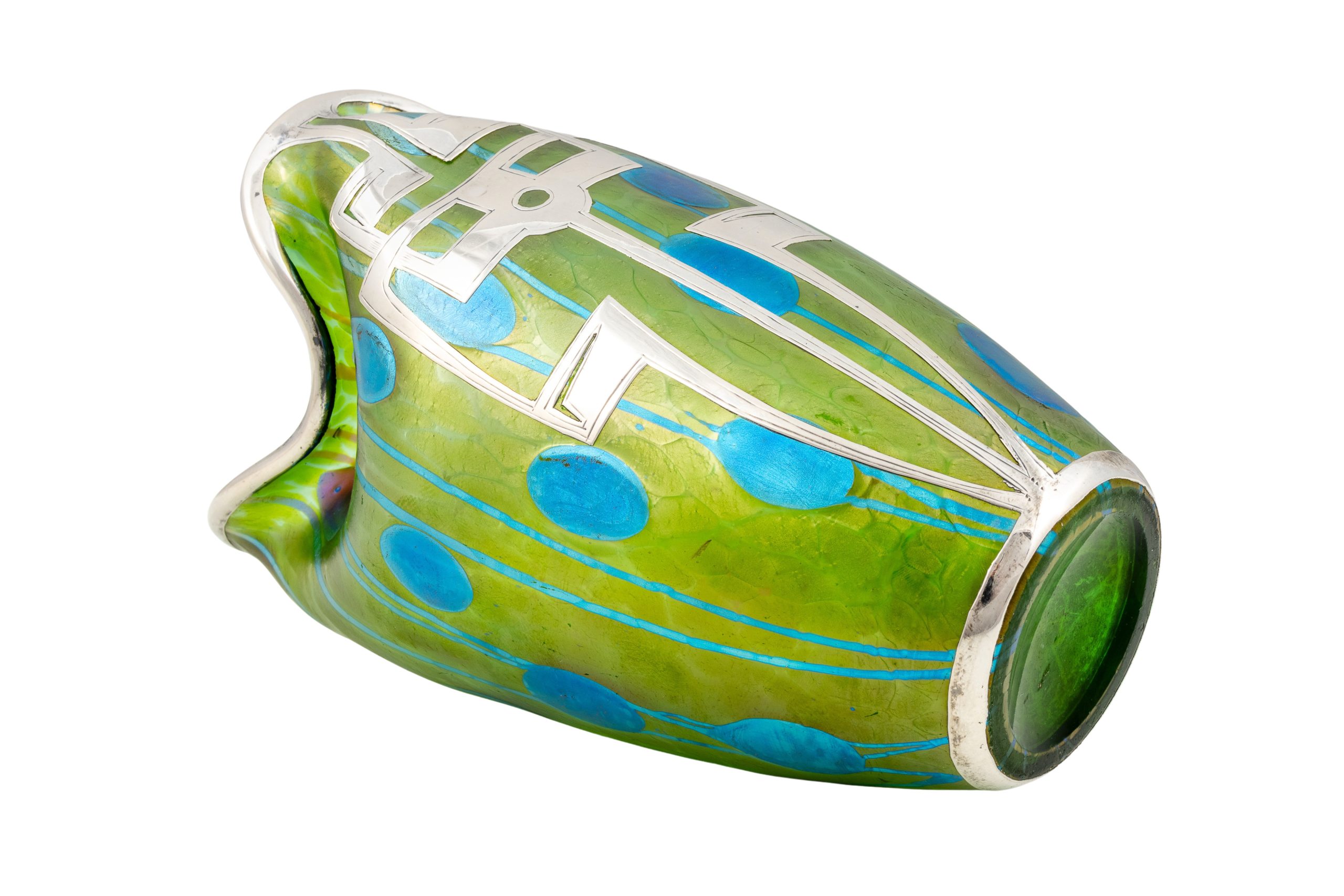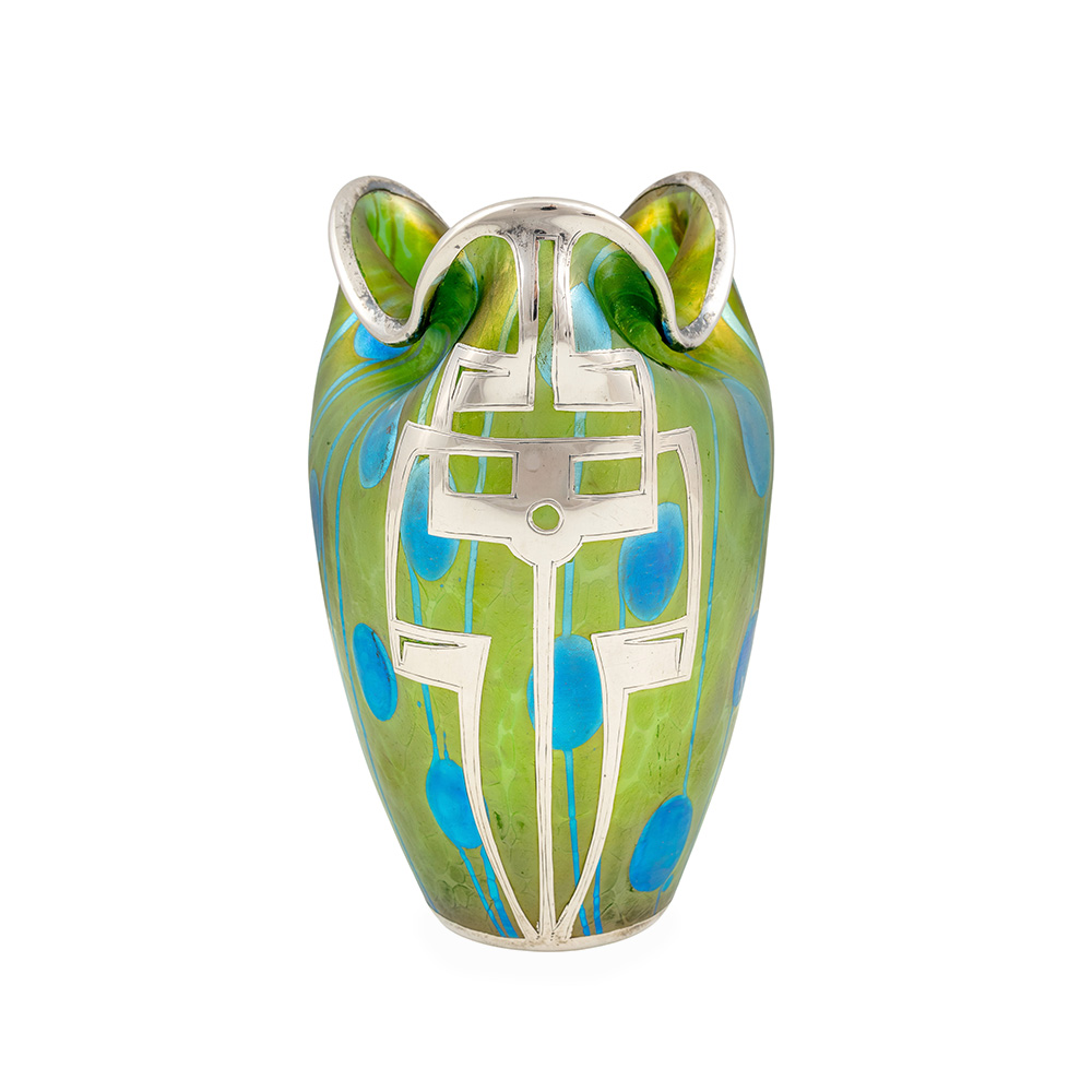 Vase mit sezessionistischem Silberbeschlag, Koloman Moser (Dekor), Max Schwarz (Silberbeschlag), Johann Loetz Witwe, Dekor Streifen und Flecken, um 1901
