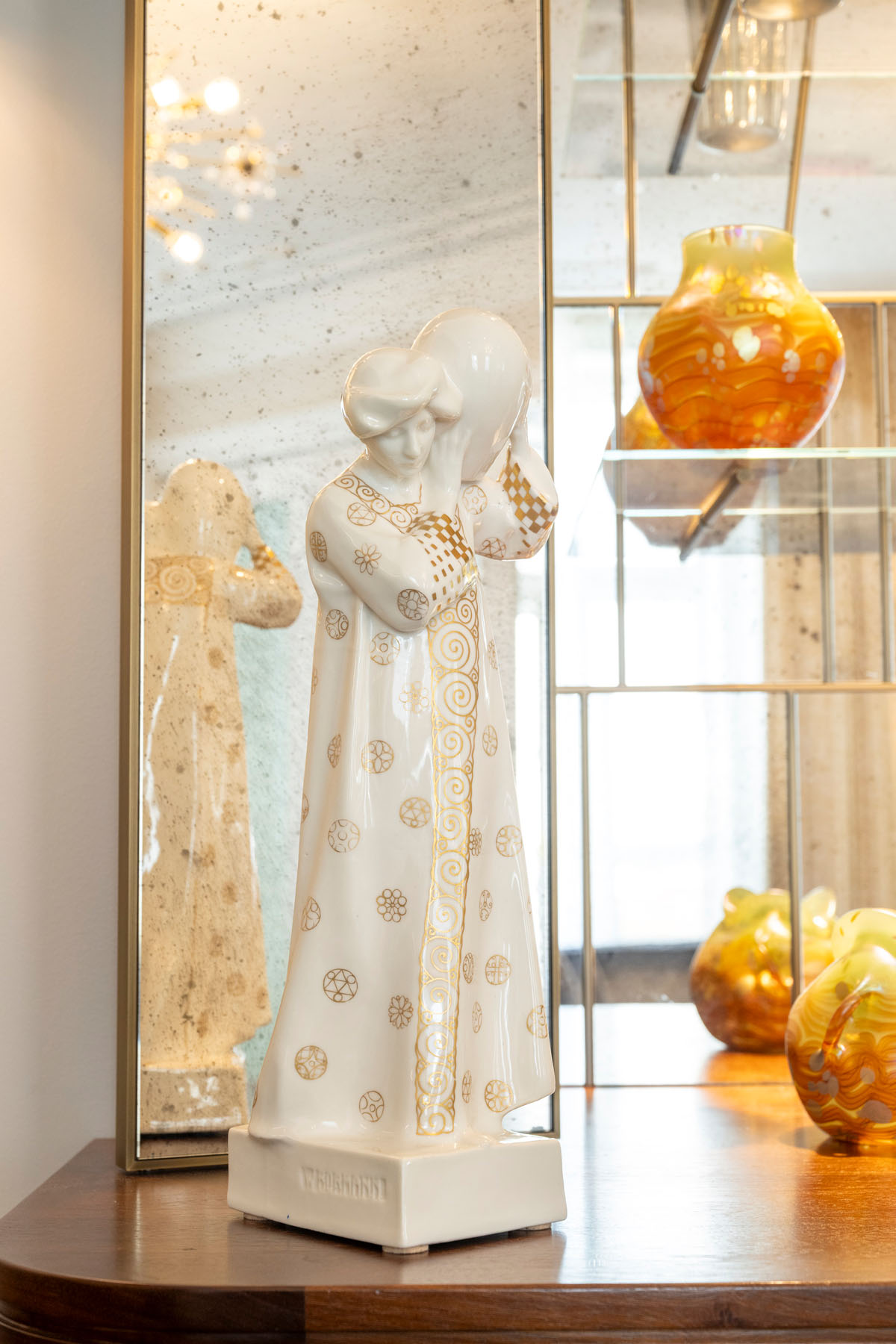Unsere Figur mit dem klingenden Namen „Die Quelle“ dürfte von Ernst Wahliss um 1903 ausgeführt worden sein. Ihre Bemalung erinnert stark an die Modeentwürfe Gustav Klimts und ist ein klassisches Beispiel für die secessionistische Ästhetik.